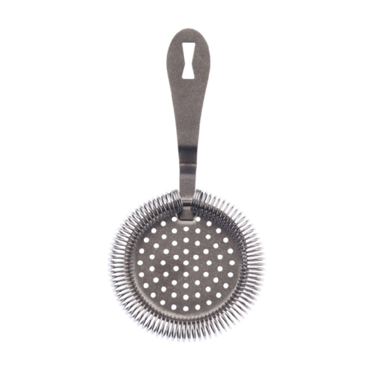 The Mercer Culinary M37218VN Barfly® Deluxe Antique Hawthorne Bar Strainer - 7 1/4" overall length is a distinguished tool designed for the refined bartender. Crafted with precision, this strainer is constructed from durable 18/8 stainless steel, ensuring longevity and resistance to corrosion, a vital feature for high-volume bars where durability is paramount. Its vintage finish adds a touch of elegance and nostalgia, appealing to mixologists seeking to enhance their barware collection with a classic aesthetic. The strainer's 7 1/4" length provides optimal control for straining cocktails, and the inclusion of a hanging hole offers convenient storage options, allowing for easy accessibility during fast-paced service. The Mercer Culinary M37218VN is not only functional but also stylish, making it an excellent choice for upscale bars, cocktail lounges, and even home enthusiasts who appreciate quality craftsmanship. Designed to meet the demands of various market segments, from professional bartenders to home mixologists, this bar strainer represents a blend of traditional design and modern utility. Its unique combination of features and elegant design positions it as a must-have tool for those who value both performance and aesthetics in their bartending equipment.