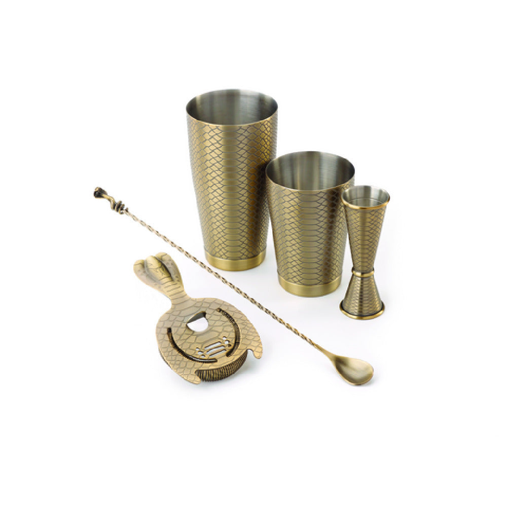 Mercer Culinary, M37300SPTABR, Venym™ Basics Set, 5-piece, includes (1) full size and (1) half size shakers, (1) 1 oz. x 2 oz. jigger, (1) 13-3/16" bar spoon and (1) heavy-duty spring bar strainer, 18/8 stainless steel core, color retail gift box, antique bronze snakeskin finish