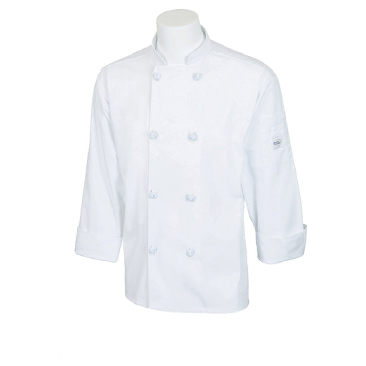 The Mercer Culinary M60012WH3X Millennia® Unisex Jacket stands out with its 65/35 poly-cotton twill composition, seamlessly blending comfort and durability for professional kitchen environments. This jacket, crafted in a pristine white color, is specifically designed to cater to various culinary professionals, providing a unisex fit that ensures inclusivity and ease of wear for both men and women. Size-wise, it comes in a 3X, addressing the needs of those seeking larger fits without compromising on style or function. A key feature of this jacket is its array of (8) cloth knot buttons, delivering a traditional and elegant closure system that is both practical and aesthetically pleasing. Additionally, the inclusion of a shoulder pocket offers convenient storage for small essentials, enhancing the functionality of the jacket for chefs who require quick access to tools during high-pressure kitchen operations. The Mercer Culinary M60012WH3X Millennia® Jacket is a quintessential choice for culinary professionals seeking a blend of style, reliability, and practicality, making it a valued addition across diverse segments of the culinary industry. Its thoughtful design reflects an understanding of the demanding nature of kitchen environments, providing chefs with a garment that supports their daily endeavors while maintaining a professional appearance.