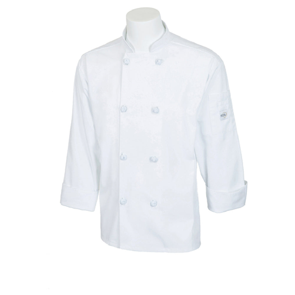 The Mercer Culinary M60012WH5X Millennia® Unisex Jacket is a meticulously designed garment, crafted for culinary professionals who value both functionality and style in their uniforms. This jacket is distinguished by its eight cloth knot buttons, which provide a secure and traditional fastening method while enhancing the jacket's classic aesthetic. Made from a durable 65/35 poly/cotton twill blend, the fabric offers both comfort and resilience, essential for enduring the rigorous demands of professional kitchens. The jacket is presented in a crisp white color and is available in a 5X size, accommodating a broad range of body types, making it an inclusive choice for diverse culinary teams. A practical shoulder pocket adds a convenient storage option for small tools or personal items, emphasizing the jacket's utility. Designed to be unisex, this jacket serves a wide audience, from chefs to other kitchen staff, reflecting its adaptability across various culinary roles. Ideal for chefs who require durable, comfortable, and easy-to-maintain attire, the Mercer Culinary M60012WH5X Millennia® Unisex Jacket excels in combining professional appearance with practical features, making it a standout choice within the industry.