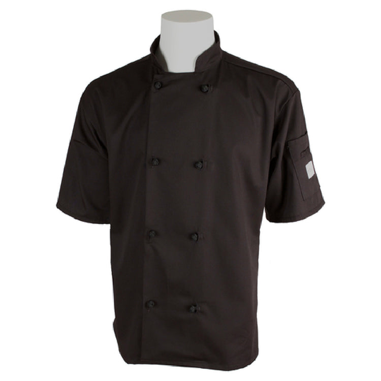 The Mercer Culinary M60014BKL Millennia® Unisex Jacket - Short Sleeve is a professional garment designed for culinary experts seeking both style and functionality. Featuring eight cloth knot buttons, this jacket embodies a classic culinary aesthetic while ensuring durability and ease of use. Crafted from a high-quality 65/35 poly-cotton twill blend, it offers a balance of comfort and resilience, making it suitable for the demanding environments of professional kitchens. The jacket is presented in a versatile black color and is available in a large size, catering to a wide range of wearers. Its short sleeve design is ideal for maintaining comfort in heated kitchen conditions, while a practical shoulder pocket provides convenient storage for essential tools or personal items. The Mercer Culinary M60014BKL Millennia® Unisex Jacket is an excellent choice for culinary professionals across various sectors, from bustling restaurant kitchens to culinary education settings, offering a blend of practicality, durability, and professional style.