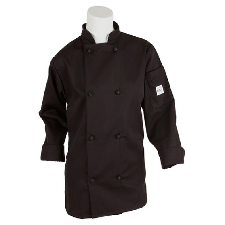 The Mercer Culinary M60022BKXS Millennia Women's Jacket stands out as a meticulously designed garment tailored for culinary professionals. Featuring eight cloth knot buttons, this jacket prioritizes both style and functionality, offering a secure and classic closure system. The inclusion of a shoulder pocket provides convenient storage, allowing chefs to keep essential tools or notes within easy reach. Crafted from a 65/35 poly/cotton twill, the jacket boasts a blend that ensures durability and comfort, making it an ideal choice for the high-paced environments of kitchens. The center back kick pleat not only enhances mobility but also contributes to a flattering fit, accommodating the dynamic movements of culinary tasks. Available in a sleek black color and x-small size, this jacket is designed to meet the needs of diverse culinary professionals, especially those seeking a balance between professional presentation and practicality. The Mercer Culinary M60022BKXS Millennia Women's Jacket is crafted to endure the demands of the culinary industry while maintaining a polished appearance, making it a valuable addition to any chef's wardrobe.