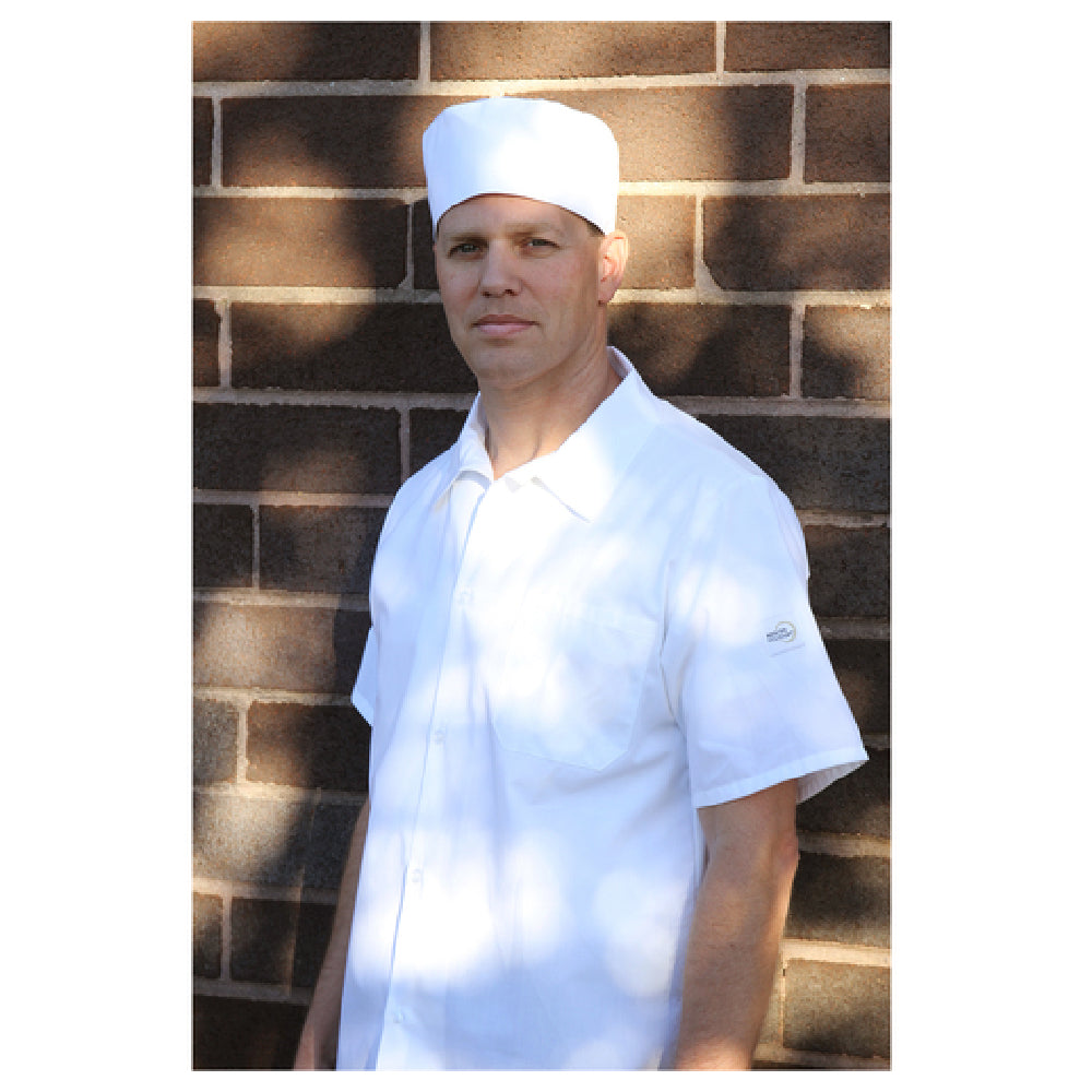 The Mercer Culinary M60200WH3X Millennia® Unisex Cook Shirt - (5) Traditional Buttons Mesh Back is a versatile garment engineered for professional culinary environments. Designed in size 3X, this cook shirt is crafted from a blend of 65/35 poly-cotton poplin, combining comfort and durability to withstand the demands of busy kitchens. The shirt features a traditional five-button closure, ensuring a secure fit and a classic aesthetic suitable for diverse culinary settings. A mesh back enhances breathability, making it ideal for long hours of wear in high-temperature environments, while vented sides contribute to increased airflow, promoting comfort and ease of movement. The inclusion of a chest pocket provides practicality, offering convenient storage for small essentials commonly needed in kitchen operations. Presented in a crisp white finish, the Millennia® Unisex Cook Shirt meets the aesthetic and functional needs of chefs, line cooks, and kitchen staff across various sectors within the food industry, from restaurants and catering companies to educational institutions and culinary competitions. This cook shirt exemplifies Mercer Culinary's commitment to quality and performance, providing a reliable attire solution that aligns with the rigorous standards of modern culinary professionals.