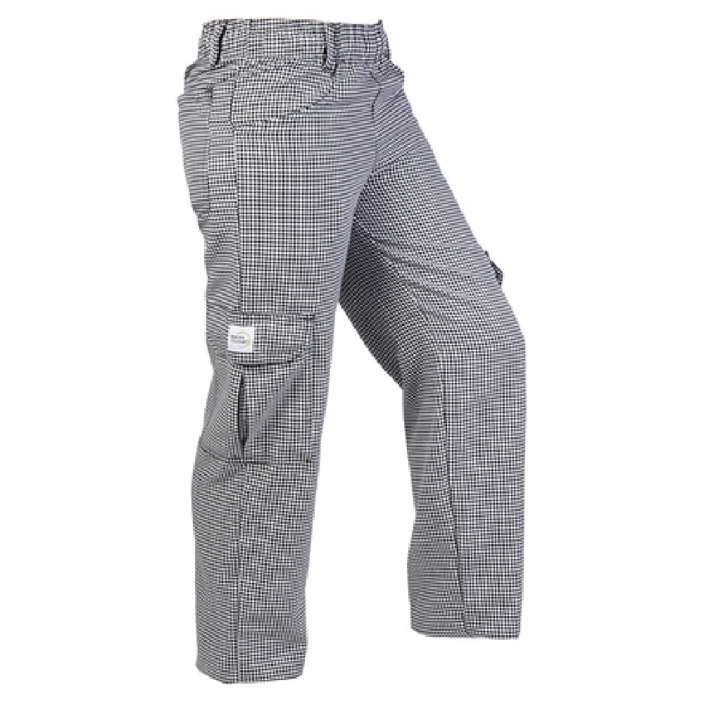 The Mercer Culinary M61071HTXS Genesis Women's Cargo Pants are crafted with precision to meet the demands of culinary professionals while ensuring comfort and style. These pants boast an elastic waist and belt loops, providing a flexible fit that accommodates a range of body types, particularly in the x-small size. The design incorporates six functional pockets, including leg pockets with Velcro flaps, which are ideal for chefs needing accessible storage during busy shifts. Finished cuffs add a touch of refinement to the pants, making them suitable for both kitchen and dining room environments. Constructed from a 65/35 yarn-dyed poly/cotton blend, these pants feature a classic black and white houndstooth pattern, offering both durability and a timeless aesthetic. This fabric composition ensures longevity and easy care, crucial for the demanding environment of professional kitchens. The unique combination of utility, comfort, and style makes the Genesis Women's Cargo Pants a versatile choice for culinary professionals seeking reliable workwear. Their thoughtful design caters to the practical needs of chefs, providing ample storage and comfort without compromising on professional appearance.