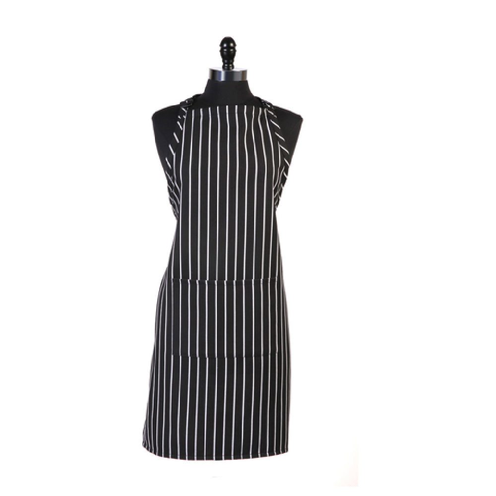 Mercer Culinary M61110BCS Genesis Bib Apron - 33" x 23" with Pocket is a meticulously designed culinary accessory catering to the needs of professional chefs and culinary enthusiasts alike. This apron features a practical adjustable neck strip, allowing users to tailor the fit for utmost comfort during long hours in the kitchen. Crafted from a durable 65/35 poly-cotton twill, the fabric blend provides a balance of strength and breathability, ensuring resilience against daily wear while maintaining a lightweight feel. The apron’s dimensions, 33 inches in length and 23 inches in width, provide ample coverage, safeguarding clothing from spills and splatters. The inclusion of a convenient front pocket enhances its functionality, offering easy access to essential tools and accessories. Its striking black Chalk Stripe design adds a touch of sophisticated style, appealing to diverse markets ranging from bustling restaurant kitchens to home cooking enthusiasts. This apron not only meets the aesthetic demands of the industry but also holds up to the rigorous standards expected in professional kitchen environments, making it a versatile choice for anyone seeking quality and reliability in their culinary apparel.
