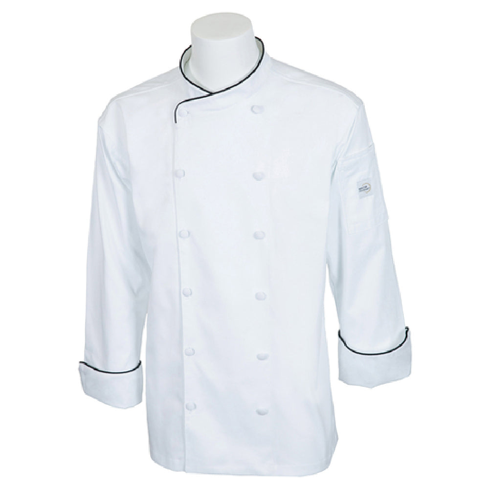 The Mercer Culinary M62020WB3X Renaissance Men's Jacket is an elegant and functional garment tailored for professionals in the culinary industry. This jacket, marked by its stylish color scoop neck, is accentuated with 12 cloth-covered buttons, offering a classic and refined appearance. Made from a durable blend of 65/35 poly/cotton twill, this jacket ensures both comfort and resilience, maintaining its shape and appearance even after extensive use. The jacket's white fabric is tastefully offset with black piping on the neck and cuffs, adding a subtle touch of sophistication. Designed for practicality as well as style, it includes a utility shoulder pocket for convenient storage of small items, and an ear bud opening, enhancing its functionality for the modern chef. Available in a 3X size, this jacket caters to a broad range of body types, ensuring a comfortable fit for every wearer. The Mercer Culinary M62020WB3X Renaissance Men's Jacket is a distinctive choice for culinary professionals seeking a blend of traditional style and modern practicality in their kitchen attire.