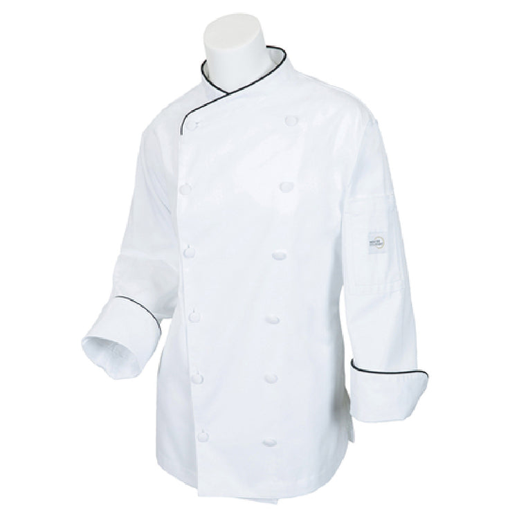 The Mercer Culinary M62050WB3X Renaissance Women's Jacket - scoop neck - is meticulously crafted to combine functionality and elegance, tailored specifically for professional culinary environments. This jacket features twelve cloth-covered buttons that not only enhance its sophisticated appearance but also ensure durability in demanding kitchen settings. Its utility shoulder pocket is thoughtfully designed for easy access to essential tools, while the ear bud opening facilitates seamless communication and multitasking. The jacket is constructed from a 65/35 poly/cotton twill blend, offering a balance of comfort and resilience, essential for long hours in dynamic kitchen environments. Its white fabric is stylishly accented with black piping on the neck and cuffs, providing a sleek and professional aesthetic. Side slits are incorporated to enhance mobility, crucial for chefs who require ease of movement while working. Available in 3X size, this jacket caters to a diverse range of body types, ensuring all chefs can perform with confidence and comfort. Whether you're a chef in a bustling restaurant, a caterer at a high-profile event, or a culinary student honing your skills, the Mercer Culinary M62050WB3X Renaissance Women's Jacket is an invaluable addition to any kitchen wardrobe, emphasizing both practicality and style.