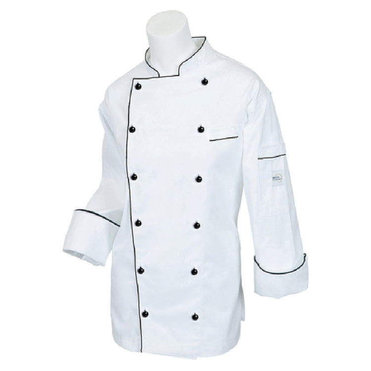 The Mercer Culinary M62095WB1X Renaissance Women's Jacket stands as a hallmark of professional culinary apparel, featuring a traditional neck design and an intricate assembly of twelve push-through black buttons. This jacket is crafted with a fabric blend of 65/35 poly/cotton twill, ensuring durability and comfort. The jacket's aesthetic is elevated by its white color complemented with full black piping, delivering a classic yet modern look. Practicality is enhanced with a shoulder pocket and a chest welt pocket, providing convenient storage options for the busy chef. Side slits offer additional comfort and mobility, facilitating ease of movement in a dynamic kitchen environment. Tailored to the 1X size specification, this jacket seamlessly blends functionality with style, making it ideal for culinary professionals across various market segments, from restauranteurs to hospitality industry chefs. The Mercer Culinary M62095WB1X Renaissance Women's Jacket is a versatile garment that marries elegance with performance, ensuring that chefs look and feel their best while navigating the demands of their culinary duties.