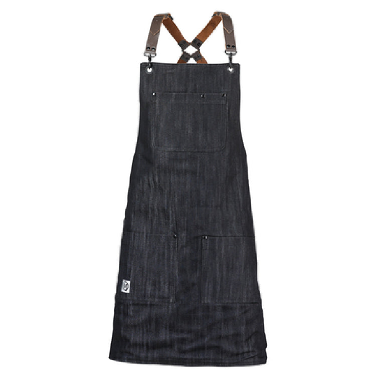 The Mercer Culinary M63208DENBR Metro Edge® Bib Apron - 25" x 30-1/2" is a meticulously designed piece that combines functionality and style, making it a valuable addition for professionals in culinary environments. With dimensions of 25 inches by 30-1/2 inches, this apron ensures ample coverage, providing protection and convenience during rigorous kitchen tasks. The apron is constructed from 100% cotton denim, offering durability and comfort for extended use. Its standout feature includes leather cross-back straps, which are adjustable and easily removable, allowing for a customizable fit that reduces strain during long hours of wear. Enhancing its design are powder-coated metal closures, ensuring reliability and a sleek aesthetic. The apron is equipped with three exterior pockets and two interior pockets, offering generous storage space for tools and essentials, ideal for chefs and culinary artists. Black rivet accents at pocket corners reinforce its durability, complementing the apron’s robust structure. The black denim exterior paired with brown leather straps adds a touch of sophistication, appealing to both contemporary and traditional kitchen settings. The Mercer Culinary M63208DENBR apron is a versatile choice, catering to the needs of chefs, bartenders, and hospitality professionals who seek a blend of practicality and elegance in their work apparel.