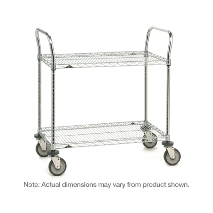 The Metro 2SPN43DC SP Heavy Duty Utility Cart is a robust and versatile solution for various industry needs, featuring dimensions of 36"W x 21"D x 39"H. This standard unit is engineered with two wire shelves, providing ample storage and organization space. Equipped with plastic split sleeves, the cart ensures stability and ease of assembly, making it suitable for dynamic work environments. Additionally, it boasts two one-piece handles for easy maneuverability and control. The cart is fitted with donut bumpers, offering protection during transport to prevent damage to walls and objects. The 5" poly casters facilitate smooth and reliable movement across different surfaces, enhancing its utility in both commercial and industrial settings. Its chrome-plated finish not only provides a sleek appearance but also adds durability and resistance to corrosion. Certified by NSF, this utility cart meets strict public health and safety standards, making it a reliable choice for food service operations, laboratories, and healthcare facilities. The Metro 2SPN43DC is designed to withstand heavy-duty use while maintaining a high level of performance, making it an indispensable asset for tasks requiring mobility and efficient organization.