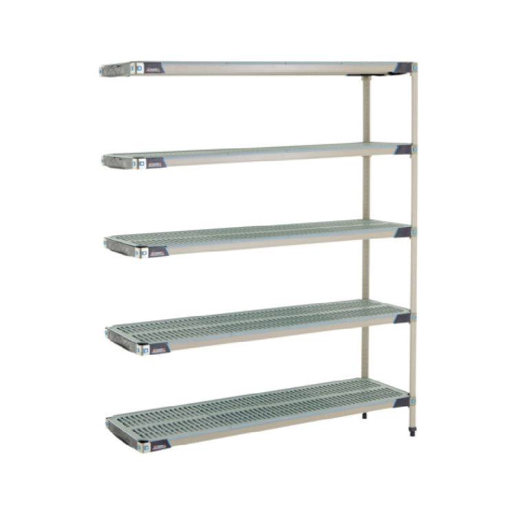 The Metro 5AX367GX3 MetroMax® I Add-On Shelving Unit 60"W X 18"D X 74"H Rust Proof is a remarkable solution for those seeking durable and versatile storage in industrial and commercial environments. Engineered to support up to 750 pounds per shelf, with an overall unit capacity of 2000 pounds, this shelving unit is designed to meet heavy-duty storage needs. It features five open grid polymer shelves, each reinforced with type 304 stainless steel corners, ensuring robustness and longevity. The removable polymer shelf mats add to the convenience, making cleaning and maintenance straightforward. With its rust-proof construction, the unit guarantees reliability and robustness over time. The inclusion of Microban antimicrobial product protection ensures a hygienic storage solution, which is crucial for sectors such as healthcare and food services. This kit also comes with a set of four wedge connectors, two polymer posts, and ten "S" hooks, allowing for a secure end-to-end configuration. Certified by the NSF, this shelving unit meets the highest standards of public health protection. Its knock-down (KD) design supports easy assembly and reconfiguration, making it an adaptable and valuable asset for various industries seeking efficient, secure, and customizable storage solutions.