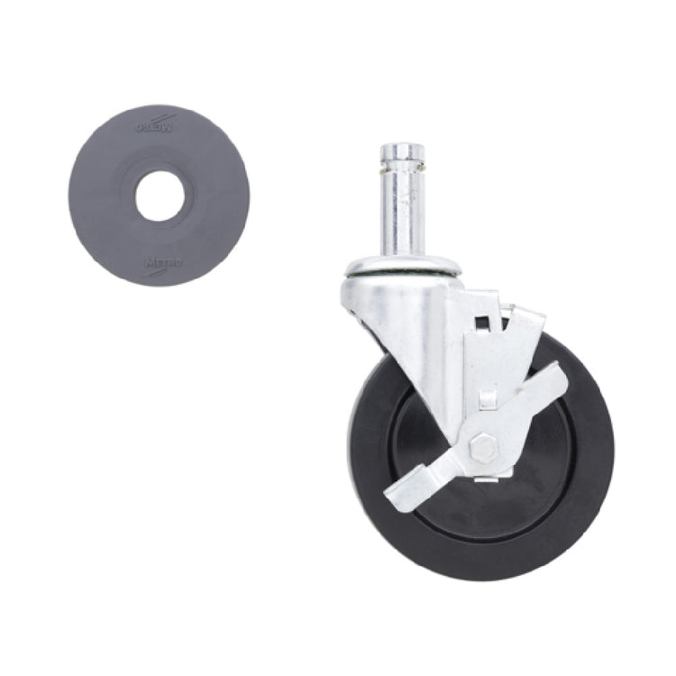The Metro 5MB Quick Ship Super Erecta® Stem Caster Swivel (with Foot Operated Brake) is an essential component designed for efficiency and versatility in various industrial environments. With a 5-inch diameter and a 1-1/4 inch face, this caster is engineered to support a substantial load capacity of up to 200 pounds, making it ideal for heavy-duty applications. The inclusion of a foot-operated brake adds an element of safety and control, allowing for secure positioning of equipment. Its resilient rubber flat wheel tread ensures smooth, quiet operation while minimizing wear on both the caster and flooring surfaces. This caster also features an integrated bumper, providing additional protection to surrounding equipment and structures. The Quick Ship attribute underscores its availability, catering to industries that demand prompt delivery and installation. The Metro 5MB is tailored to meet the needs of different market segments, including warehousing, healthcare, and food service operations, where reliable mobility and stability are paramount. Its design is a testament to Metro’s commitment to quality and innovation, offering a practical solution for organizations looking to enhance their operational efficiency with durable and efficient caster technology.