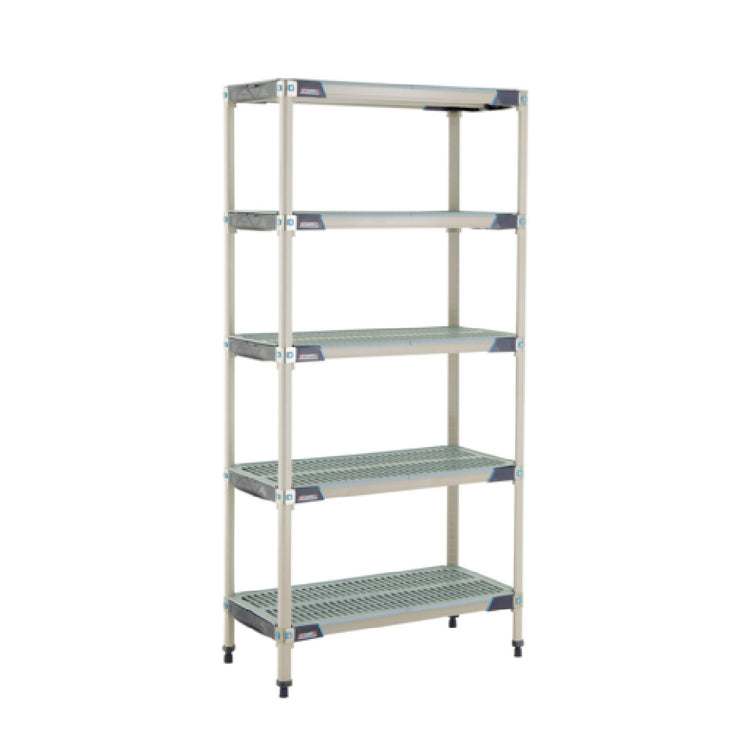 The Metro 5X337GX3 MetroMax® I Starter Shelving Unit - 36"W x 18"D x 74"H - Rust Proof is an exceptional storage solution designed to meet a variety of organizational needs across different industries. This robust shelving unit boasts a substantial weight capacity, supporting up to 1000 lb. per shelf and 2000 lb. per unit, which makes it ideal for heavy-duty storage demands. The unit is constructed with five open grid polymer shelves, each reinforced with type 304 stainless steel corners and removable polymer shelf mats, ensuring durability and rust resistance. Adding to its versatility, the shelving system includes a bag of four wedge connectors with each shelf and four polymer posts, facilitating easy assembly and customization. With Microban antimicrobial product protection integrated into its design, the MetroMax I shelving unit offers an additional layer of defense against bacteria and mold, making it suitable for settings where hygiene is critical. The knockdown (KD) configuration allows for efficient shipping and storage when not in use. Additionally, the unit is NSF certified, attesting to its compliance with rigorous health and safety standards. This MetroMax I shelving unit is engineered to deliver outstanding performance, making it an invaluable asset in commercial kitchens, healthcare facilities, and other professional environments where reliability and cleanliness are paramount.