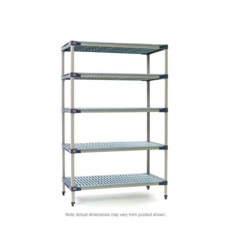 The Metro 5X447G4 MetroMax® 4 Starter Shelving Unit is a highly durable and versatile storage solution, measuring 42"W x 21"D x 74"H. This unit is designed to withstand harsh environments with its rust-proof construction, making it ideal for a variety of industrial applications. Each of the five open grid all-polymer shelves can support an impressive 800 lb., while the entire unit boasts a total capacity of 2000 lb. This shelving system includes removable shelf mats for easy cleaning and maintenance, enhancing its practicality in demanding settings. The package contains a bag of four wedge connectors for each shelf, ensuring sturdy assembly and stability. Supported by four polymer posts, this unit features Microban antimicrobial product protection, which helps inhibit the growth of odor-causing bacteria, mold, and mildew, thereby promoting a hygienic storage environment. The MetroMax® 4 Starter Shelving Unit is a knock-down (KD) unit for convenient transport and assembly. In addition, it holds NSF certification, guaranteeing that it meets strict standards for public health protection. This shelving unit is particularly well-suited for sectors requiring reliable and robust storage solutions, such as healthcare, food service, and industrial supply management.