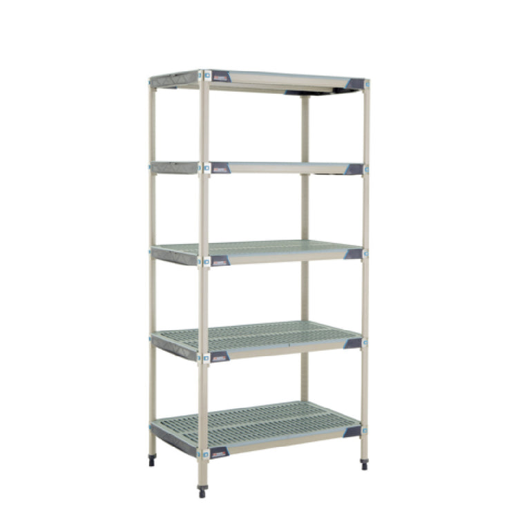 The Metro 5X537GX3 MetroMax® I Starter Shelving Unit is a robust and versatile storage solution, featuring dimensions of 36"W x 24"D x 74"H. Each of its five open grid polymer shelves boasts a substantial 1000 lb. capacity, while the entire unit supports up to 2000 lb., ensuring reliability for various storage needs. Notably, the shelving unit is rust proof, offering a long-lasting solution for environments prone to moisture. Enhanced with Microban antimicrobial product protection, it promotes a cleaner and more hygienic storage area. The shelves include reinforced type 304 stainless steel corners and removable polymer shelf mats, contributing to both durability and ease of maintenance. The unit is designed for straightforward assembly with a bag of four wedge connectors for each shelf and four sturdy polymer posts. Certified by the NSF, this shelving solution is particularly suitable for industries that prioritize hygiene and sanitation, such as food service or healthcare environments. Its knock-down (KD) design facilitates convenient shipping and storage. Whether utilized in a commercial kitchen, medical facility, or industrial setting, the MetroMax® I Starter Shelving Unit provides a reliable, easy-to-maintain storage system with superior load-bearing capabilities and rust-resistant features.