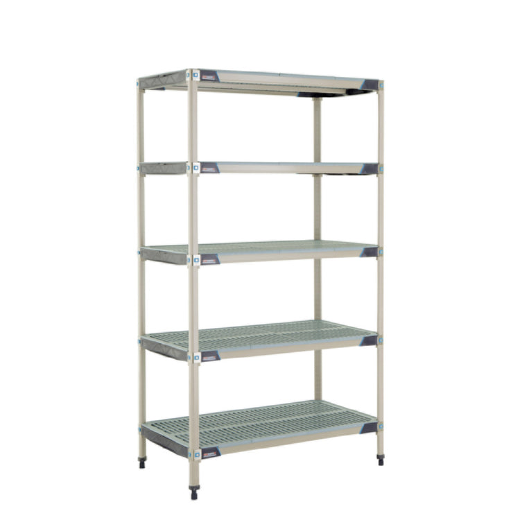 The Metro 5X547GX3 MetroMax® I Starter Shelving Unit - 42"W x 24"D x 74"H - excels in environments demanding durable, rust-proof storage solutions. Each of the five open grid polymer shelves, reinforced with type 304 stainless steel corners, supports up to 1000 lb., while the entire unit boasts a robust 2000 lb. capacity. This makes it an ideal choice for industries requiring heavy-duty storage, such as food service, healthcare, and industrial sectors. The inclusion of Microban antimicrobial product protection ensures that hygiene standards are maintained, an essential feature in settings where cleanliness is paramount. The unit comes with removable polymer shelf mats, enhancing cleaning convenience, and a bag of four wedge connectors with each shelf for easy assembly. Supported by four sturdy polymer posts, this shelving unit is NSF certified, ensuring compliance with strict public health and safety regulations. Its knock-down (KD) design simplifies transportation and setup, making it adaptable for varied spatial requirements. The Metro 5X547GX3 MetroMax® I provides a reliable, long-lasting storage solution tailored to meet the needs of professionals seeking efficiency, cleanliness, and structural integrity in their storage systems.