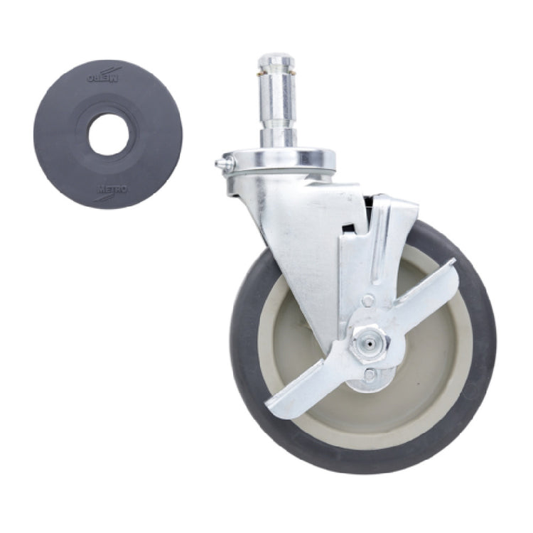 The Metro 6MPB Super Erecta® Stem Caster Swivel (with Foot Operated Brake) 6" Dia. is engineered to deliver superior mobility and stability for various industrial applications. This caster is characterized by a 6-inch diameter wheel with a 1-1/2 inch face, providing a smooth and sturdy rolling experience on diverse surfaces. Built with a robust polyurethane flat wheel tread, it ensures durability and resistance against wear and tear, making it suitable for heavy-duty use across multiple sectors. The caster boasts an impressive weight capacity of 400 pounds, accommodating a broad range of equipment and storage units. An integrated foot-operated brake adds convenience, allowing users to easily secure equipment in place, enhancing safety and operational efficiency. The inclusion of a bumper offers additional protection, preventing damage to both the caster and surrounding structures. These technical specifications make the Metro 6MPB an invaluable component in environments that demand high performance and reliability, such as in warehouses, manufacturing plants, and commercial kitchens. Its thoughtful design not only enhances its functionality but also extends its lifespan, offering a dependable solution for professionals seeking quality and precision in their equipment support systems.