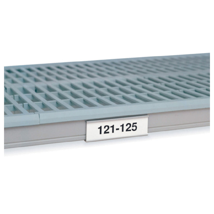 The Metro 9989PX Quick Ship MetroMax® I Label Holder is a practical and versatile addition for organizing and labeling within diverse sectors ranging from industrial to commercial settings. This 1" x 4 1/2" plastic label holder is engineered to fit all shelves seamlessly, a feature that underscores its adaptable design. It snaps on easily over the shelf edge, eliminating the need for complicated installations or tools, thus enhancing its usability across various shelving systems. While the label itself is not included, the holder is designed to accommodate standard labels, making it a flexible solution for inventory management and product identification. As an NSF-certified product, it meets stringent standards for public health protection, ensuring its suitability for use in environments that require compliance with specific health and safety regulations. The Metro 9989PX, with its blend of durability and ease of use, is an essential tool in any setting where organized and efficient labeling is crucial, from bustling warehouses to detail-oriented laboratory environments.