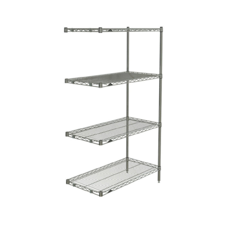 The Metro AN336BR Super Erecta® Add-On Shelving Unit 36"W x 18"D x 63"H is a versatile storage solution designed for a variety of industry applications, from commercial kitchens to warehouse settings. This unit features dimensions of 36 inches in width, 18 inches in depth, and 63 inches in height, offering ample storage capacity with its four wire shelves. Engineered with two posts and strategically paired with two "S" hooks per shelf, this shelving unit promises stability and ease of assembly. Its Super Erecta Brite™ finish not only enhances its aesthetic appeal but also provides a durable and resilient surface that withstands daily wear and tear. The unit is shipped in a knock-down (KD) form, facilitating convenient transport and assembly. Furthermore, the shelving unit meets NSF certification standards, ensuring compliance with public health and safety protocols. This makes it an ideal choice for environments requiring high standards of hygiene, such as food service establishments and healthcare facilities. The Metro AN336BR combines innovation with practicality, catering to the dynamic needs of professional spaces by providing a reliable and customizable storage solution.