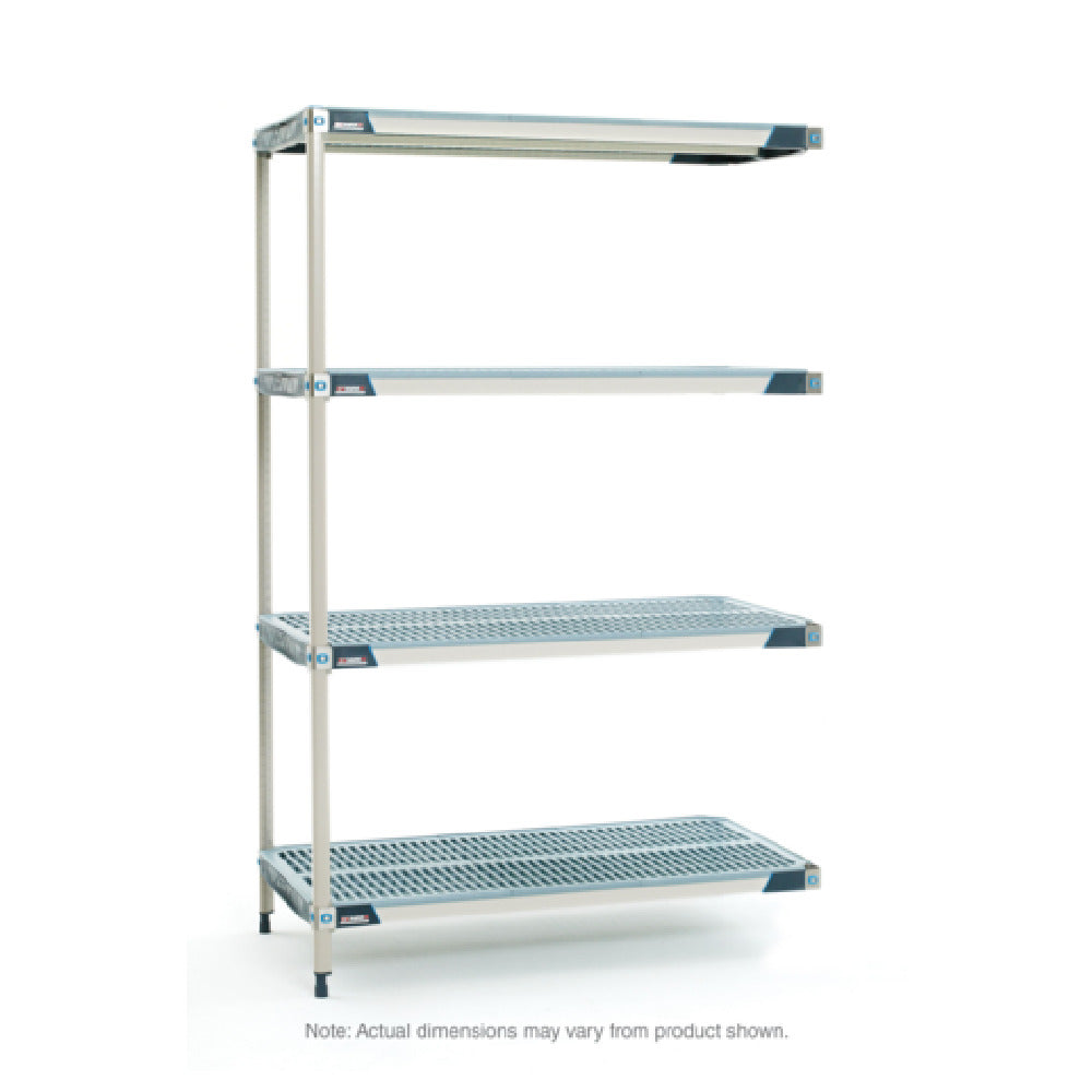 The Metro AX326GX3 MetroMax® I Add-On Shelving Unit is a meticulously engineered storage solution with dimensions of 30"W x 18"D x 63"H, specifically designed to meet the diverse needs of industries requiring rust-proof, high-capacity shelving. This unit boasts an impressive weight capacity - each of the four open grid polymer shelves can support up to 1000 lbs, with the entire unit accommodating up to 2000 lbs. These shelves are reinforced with type 304 stainless steel corners, ensuring enhanced durability and stability. The removable polymer shelf mats facilitate easy cleaning and maintenance, while a bag of four wedge connectors is included to secure the shelves. The add-on unit features two polymer posts and eight "S" hooks, allowing for a seamless end-to-end configuration, expanding storage possibilities without compromising on structural integrity. Additionally, the MetroMax® I Add-On Shelving Unit is equipped with Microban antimicrobial product protection, rendering it an ideal choice for environments demanding stringent hygiene standards. This product is KD (knockdown), enabling convenient shipment and assembly, and is NSF certified, verifying its compliance with rigorous safety and health standards. This versatile shelving unit is expertly crafted to serve various market segments seeking reliable and hygienic storage solutions.