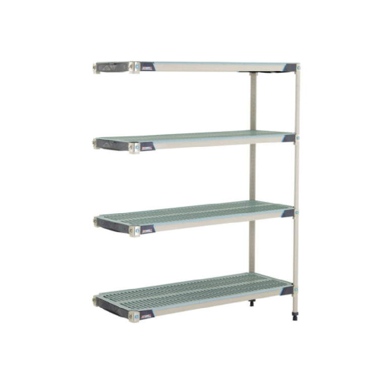 The Metro AX356GX3 MetroMax® I Add-On Shelving Unit 48"W X 18"D X 63"H Rust Proof is an advanced storage solution engineered for diverse environments requiring robust shelving capabilities. With a remarkable load-bearing capacity of 1000 lb per shelf and an impressive 2000 lb capacity per unit, this unit is designed to efficiently handle substantial weight, making it ideal for commercial kitchens, laboratories, and industrial storage. Each shelving unit includes four open grid polymer shelves reinforced with type 304 stainless steel corners, ensuring durability and resistance to corrosion. The inclusion of removable polymer shelf mats adds an extra layer of versatility and ease of maintenance. The unit features two polymer posts and eight "S" hooks, facilitating a seamless end-to-end configuration, optimizing space utilization. Additionally, the MetroMax® I incorporates Microban antimicrobial product protection, supporting stringent hygiene standards. The unit is supplied with a bag of four wedge connectors for easy assembly. Its knock-down (KD) design enhances portability and storage efficiency. Certified by NSF, this shelving unit guarantees compliance with essential safety and quality standards, making it a reliable choice for professionals seeking a durable and hygienic storage option.