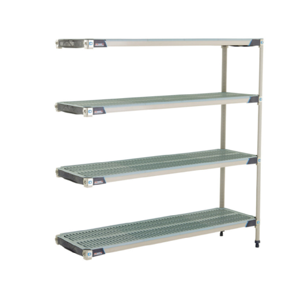 The Metro AX366GX3 MetroMax® I Add-On Shelving Unit, with dimensions of 60"W x 18"D x 63"H, is a robust storage solution crafted to meet diverse industrial needs. Engineered to be rust-proof, this unit ensures longevity and reliability in various environments. Each shelf boasts an impressive 750 lb capacity, while the entire unit can support up to 2000 lbs. The shelving includes four open grid polymer shelves, each reinforced with type 304 stainless steel corners and equipped with removable polymer shelf mats, enhancing both durability and ease of cleaning. A bag of four wedge connectors is included with each shelf, supporting secure assembly. For flexible installation, the unit comes with two polymer posts and eight "S" hooks designed for an end-to-end configuration. The Metro AX366GX3 also features Microban antimicrobial product protection, helping to maintain hygienic conditions. It is a knockdown (KD) product, facilitating convenient storage and transportation. NSF certification assures that it meets strict public health standards. This shelving unit is an invaluable asset for settings such as restaurants, warehouses, and laboratories, where robust, customizable, and hygienic storage solutions are essential.