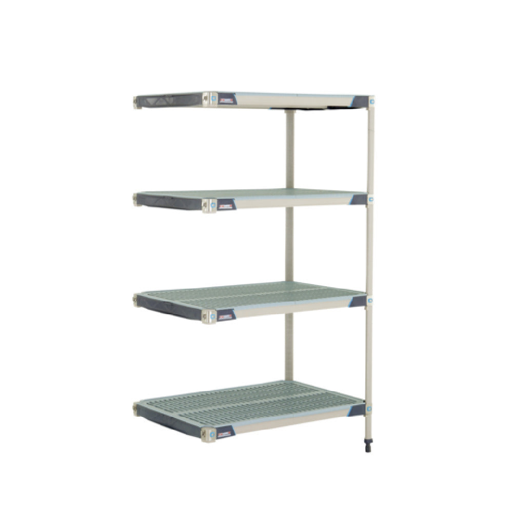 The Metro AX536GX3 MetroMax® I Add-On Shelving Unit, with dimensions of 36"W x 24"D x 63"H, is engineered to serve various industry needs where durability and capacity are paramount. Each shelf boasts a rust-proof construction and holds a remarkable 1000 lb capacity, while the entire unit supports up to 2000 lbs, offering a robust solution for storage demands. Featuring four open grid polymer shelves, it integrates reinforced type 304 stainless steel corners and removable polymer shelf mats, ensuring longevity and ease of maintenance. The unit includes a bag of four wedge connectors per shelf, facilitating secure assembly. Additionally, it comes with two polymer posts and eight "S" Hooks, allowing an end-to-end configuration that enhances versatility in spatial arrangements. Embedded with Microban antimicrobial product protection, it provides enhanced hygiene by reducing bacteria growth, a critical feature for environments demanding stringent cleanliness. The Metro AX536GX3 is KD and NSF certified, attesting to its compliance with health standards and readiness for practical, professional use. These features collectively make the shelving unit a robust and hygienic option for storage solutions in various industries, from healthcare to food service, where reliability and capacity are essential.