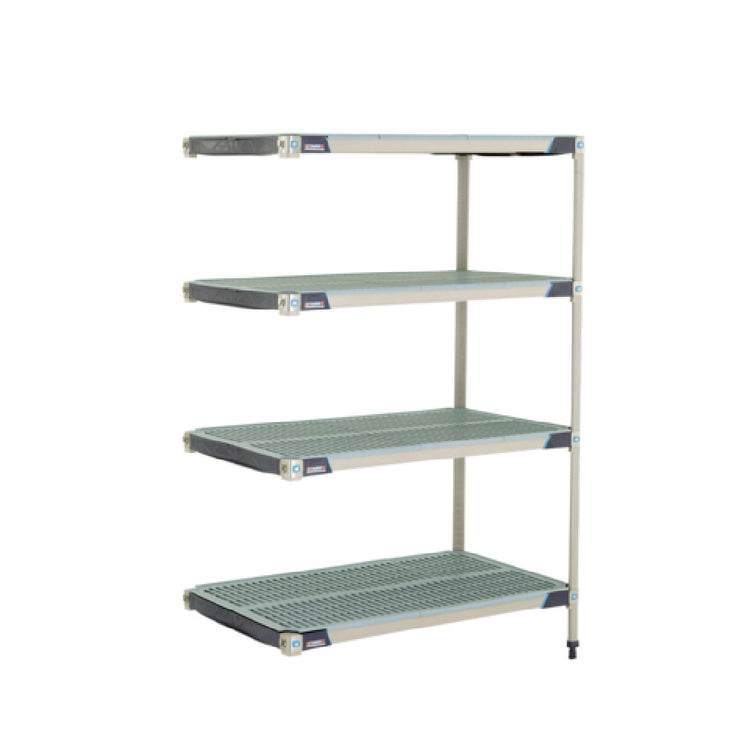 The Metro AX546GX3 MetroMax® I Add-On Shelving Unit is a precision-engineered storage solution measuring 42 inches in width, 24 inches in depth, and 63 inches in height, tailored for industries that demand durability and efficiency. Boasting rust-proof construction, this shelving unit is designed for resilience in challenging environments, featuring a substantial load capacity of up to 1000 pounds per shelf and a total capacity of 2000 pounds per unit. This model includes four open grid polymer shelves, reinforced with type 304 stainless steel corners, and removable polymer shelf mats for versatility and ease of cleaning. Each shelf comes with a bag of four wedge connectors for secure assembly. The unit is equipped with two polymer posts and eight "S" hooks, facilitating an end-to-end configuration for adaptable storage needs. The shelves incorporate Microban antimicrobial product protection, enhancing its suitability for sectors where hygiene is critical. As a knockdown (KD) unit, it is designed for straightforward assembly and mobility within professional settings. With NSF certification, the Metro AX546GX3 assures compliance with strict public health standards, making it a valuable asset for various markets, including healthcare, food service, and industrial sectors.