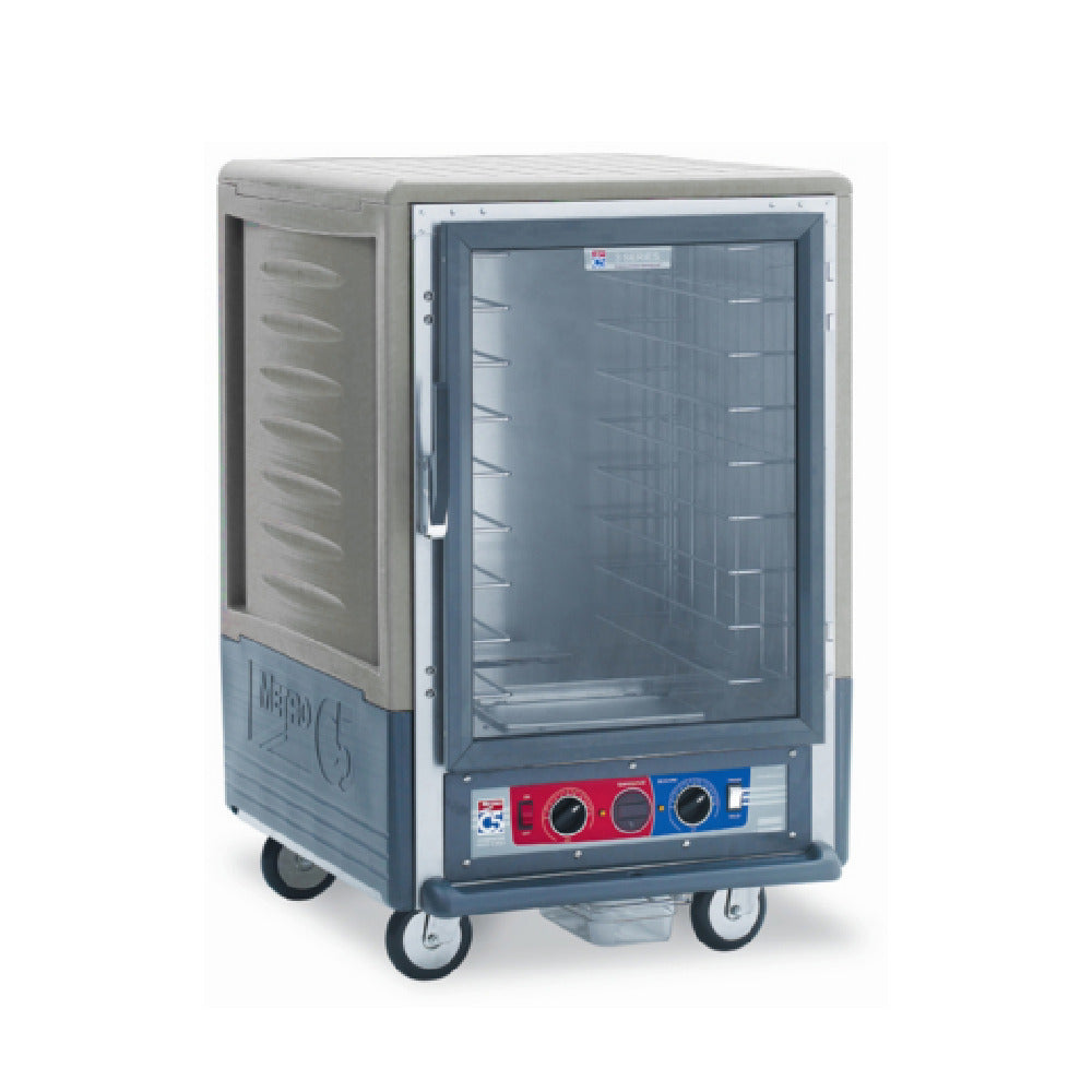 The Metro C535-CFC-4-GY C5™ 3 Series Heated Holding & Proofing Cabinet stands out with its advanced Grey Insulation Armour™, providing superior thermal efficiency for optimal food preservation. This mobile, half-height unit is meticulously designed to cater to diverse food service needs, accommodating either eight 18" x 26" pans or sixteen 12" x 20" x 2 1/2" pans with its fixed wire slides on 3" centers. The cabinet's clear polycarbonate door allows for easy visibility of contents, while the removable bottom mount control module includes a thermostat adjustable to 200°F for precise temperature regulation. Engineered for convenience, the cabinet features 5" casters, two of which come with brakes, ensuring stability and mobility. Constructed from durable aluminum, the unit operates at 120v/60/1 ph with a power consumption of 2000 watts and 16.7 amps, utilizing a NEMA 5-20P plug. With certifications including cULus and NSF, the Metro C535-CFC-4-GY is an excellent choice for industries seeking reliable, efficient, and compliant heated holding and proofing solutions.