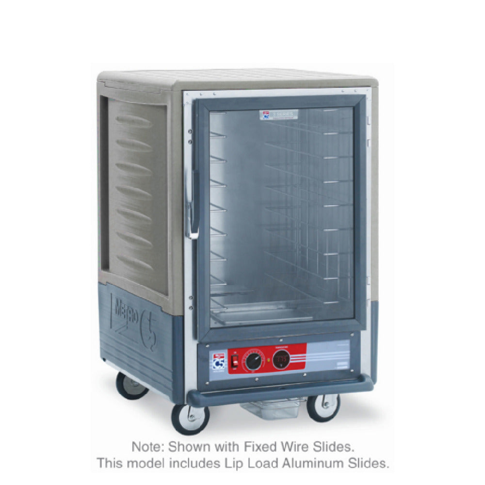 The Metro C535-HFC-L-GYA C5™ 3 Series Heated Holding Cabinet with Grey Insulation Armour™ is a mobile, half-height unit designed for optimal food holding efficiency in various foodservice environments. It boasts a clear polycarbonate door for easy viewing and a removable bottom mount control module, allowing for straightforward cleaning and maintenance. This cabinet features a thermostat adjustable up to 200°F to ensure precise temperature control, catering to the needs of sectors ranging from catering services to institutional food preparation. The lip load slides are spaced 1-1/2 inches apart, accommodating a robust capacity of seventeen 18" x 26" pans, which is ideal for high-volume operations. Enhanced with 5-inch casters, two of which have brakes, this cabinet provides the flexibility and mobility required in dynamic kitchen settings. Constructed with durable aluminum, it operates on a 120v/60/1-ph electrical connection, utilizing 2000 watts and drawing 16.7 amps, and is equipped with a NEMA 5-20P plug. Certified by cULus and NSF, this heated holding cabinet meets rigorous standards for safety and sanitation, making it a reliable solution for maintaining the quality of prepared foods across diverse culinary applications.