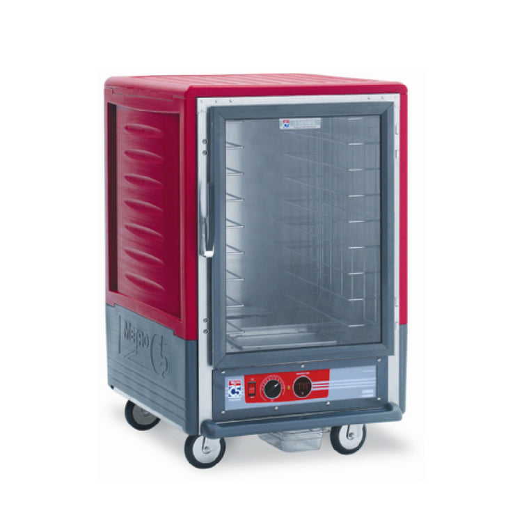 The Metro C535-HLFC-4 C5™ 3 Series Heated Holding Cabinet is a versatile solution designed for efficient food service operations, offering a lower wattage capability. This mobile, half-height cabinet is innovatively equipped with Red Insulation Armour™ to ensure superior heat retention. Featuring a clear polycarbonate door, it allows for easy monitoring of contents without compromising thermal efficiency. The removable bottom mount control module includes a thermostat adjustable up to 200°F, providing precise temperature management. Internally, the cabinet accommodates up to eight 18" x 26" pans or sixteen 12" x 20" x 2.5" pans, organized on fixed wire slides spaced at 3" centers. For ease of mobility, it is fitted with 5" casters, two of which are equipped with brakes for stability during use. Constructed from durable aluminum, this cabinet runs on a 120v/60/1 ph electrical connection, drawing 1440 watts and 12 amps, and is fitted with a NEMA 5-15P plug. Its design is certified by cULus and NSF, ensuring compliance with industry standards. The Metro C535-HLFC-4 is an ideal choice for professionals seeking a reliable and energy-efficient heated holding cabinet with enhanced insulation capabilities.