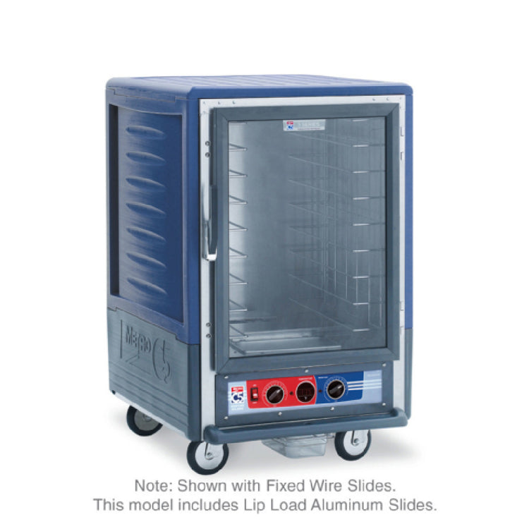 The Metro C535-MFC-L-BUA C5™ 3 Series Moisture Heated Holding & Proofing Cabinet is a versatile and innovative solution for foodservice professionals requiring reliable temperature and moisture control. This mobile, half-height cabinet is equipped with Blue Insulation Armour™ for enhanced thermal efficiency. Featuring a clear polycarbonate door, it provides easy visibility of contents while maintaining optimal conditions. The removable bottom mount control module includes a thermostat with a range up to 200°F and precise moisture control, ensuring food quality during holding and proofing. Designed with lip load slides on 1-1/2" centers, it accommodates (17) 18" x 26" pans, offering ample storage capacity. For ease of mobility, the cabinet is mounted on 5" casters, with two featuring brakes for stability. Constructed from durable aluminum, this unit operates on 120v/60/1-ph, consuming 2000 watts and drawing 16.7 amps, with a NEMA 5-20P plug configuration. Compliant with cULus and NSF standards, the Metro C535-MFC-L-BUA C5™ 3 Series cabinet is an ideal choice for commercial kitchens, bakeries, and catering services seeking a dependable and efficient holding and proofing solution that combines robust performance with user-friendly features.