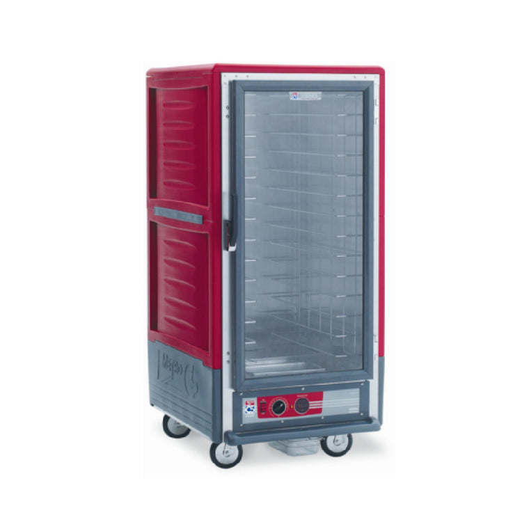 The Metro C537-HLFC-4 C5™ 3 Series Heated Holding Cabinet Lower Wattage With Red Insulation Armour™ is a mobile, 3/4 height unit designed specifically for efficient food service operations. Featuring an insulated structure with a clear polycarbonate door, it allows for easy monitoring of contents while maintaining optimal temperature. This cabinet operates with lower wattage, specifically at 1440 watts and 12 amps, powered by a 120v/60/1 ph electrical system with a NEMA 5-15P plug. The removable bottom mount control module and adjustable thermostat, capable of reaching up to 200°F, ensure precise temperature management. The cabinet holds up to 14 pans measuring 18" x 26" or 26 pans measuring 12" x 20" x 2 1/2", thanks to its fixed wire slides on 3" centers, maximizing storage capacity. With 5" casters, including two with brakes, it offers easy mobility while ensuring stability when stationary. Constructed from durable aluminum, and certified by cULus and NSF, it meets stringent safety and sanitation standards. The Red Insulation Armour™ enhances energy efficiency, making it an ideal solution for establishments seeking reliable food holding capabilities with reduced energy consumption.