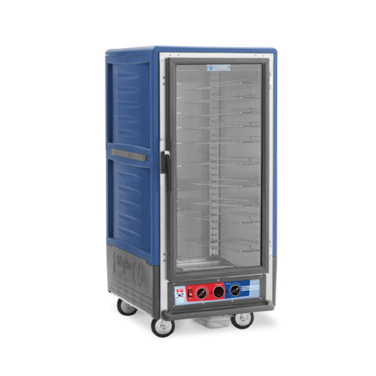 The Metro C537-MFC-U-BUA C5™ 3 Series Moisture Heated Holding & Proofing Cabinet is a versatile, mobile unit designed for professional kitchens requiring precise temperature and moisture control. This 3/4 height cabinet features Blue Insulation Armour™ that enhances thermal efficiency. The unit is designed with a clear polycarbonate door for easy monitoring of contents and a removable bottom mount control module for convenient access and maintenance. With a thermostat capable of reaching up to 200°F, it provides optimal conditions for both holding and proofing. The cabinet's universal wire slides are adjustable on 1 1/2-inch increments, accommodating up to fourteen 18-inch x 26-inch pans or twenty-six 12-inch x 20-inch x 2 1/2-inch pans, making it adaptable for various culinary needs. Equipped with 5-inch casters, of which two have brakes, the cabinet ensures stability and mobility. Constructed from durable aluminum, it operates on 120v/60/1 phase power, drawing 2000 watts and 16.7 amps, with a NEMA 5-20P plug for secure connectivity. Certified by cULus and NSF, this cabinet meets rigorous safety and sanitation standards, making it an essential asset for food service operations seeking reliability and efficiency in moisture and heat management.