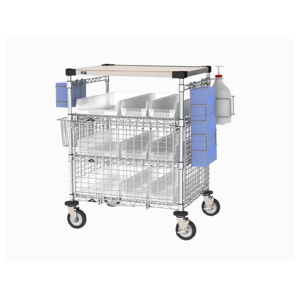 The Metro CR243033-CKST PPE Check-In Station is a meticulously designed unit measuring 43"W x 24"D, ideal for organized and efficient healthcare environments. This station features a single solid shelf complemented by three chrome shelves, providing ample storage flexibility. Two hangar rails are included for additional hanging capacity. The station also incorporates a single box holder and a triple glove box holder, ensuring that essential PPE items are always within easy reach. For sanitization needs, it includes both a 1-gallon and a 2-liter sanitizer holder, accommodating different sanitizer sizes. The unit is equipped with six MB30164CLN clear bins and three MB30174CLN clear bins, offering transparent storage solutions for various items. A basket adds extra utility for miscellaneous storage needs. Constructed from a robust combination of steel and stainless steel, this station promises durability and strength. It is mounted on four casters, two of which have brakes, facilitating both mobility and stability as needed. The Metro CR243033-CKST PPE Check-In Station is a versatile and efficient solution for medical facilities, designed to enhance organization and accessibility of personal protective equipment and sanitization supplies.