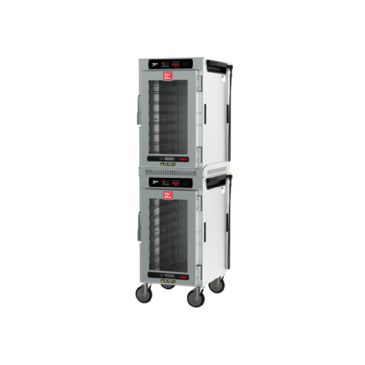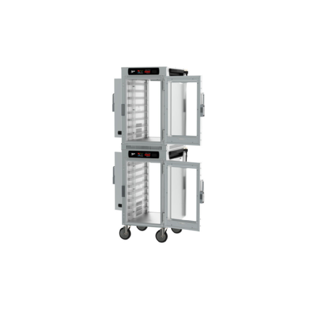 The Metro HBCN16-DCPS-M HotBlox™ Insulated Holding Cabinet is a mobile, pass-thru unit designed for optimal space efficiency in professional kitchens, featuring a narrow profile that accommodates 16 pans. This dual-cavity cabinet is equipped with a digital touchscreen controller, which allows precise temperature management for maintaining food quality. The clear front door provides easy visibility for quick inventory checks, while the solid rear door ensures optimal insulation, preserving the internal temperature. Operating at 875 watts, the unit is designed to run on two 120v/60/1-ph power sources and includes a cord with a NEMA 5-15P plug, making it compatible with standard electrical outlets. Certified by UL and NSF, this cabinet meets rigorous safety and sanitation standards, ensuring dependable use in commercial environments. Proudly made in the USA, the Metro HBCN16-DCPS-M is a strategic asset for foodservice operations, offering versatile storage solutions that prioritize efficiency and quality maintenance for various culinary establishments.