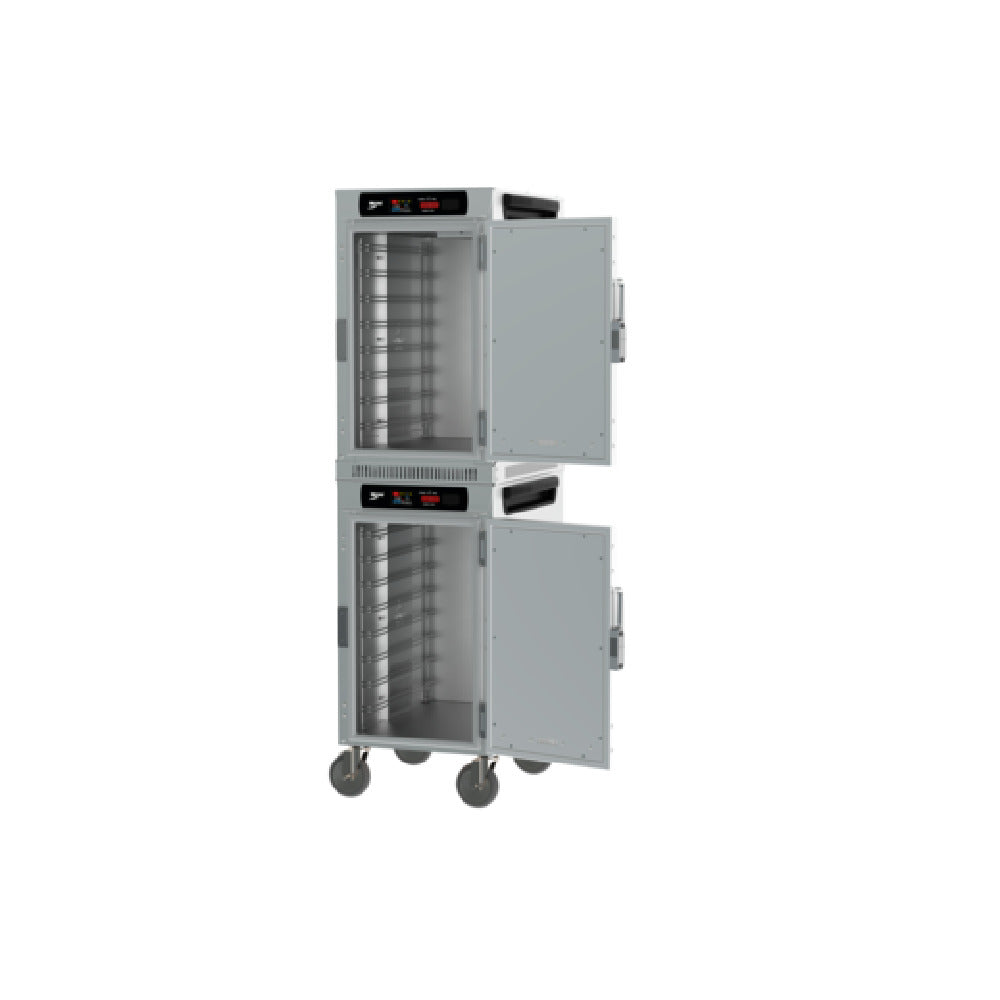 The Metro HBCN16-DS-M HotBlox™ Insulated Holding Cabinet Narrow (16) Pan Stacked Dual Cavity Mobile is a versatile solution for commercial kitchens, designed with efficiency and mobility in mind. This unit holds a capacity of 16 pans, accommodating full or half-size steam pans or half-size sheet pans. The cabinet is equipped with a 2.4-inch touchscreen control system, offering intuitive operation and precise temperature management. Its dual cavity design allows for independent operation, enhancing flexibility and efficiency in busy foodservice environments. Featuring a solid door for optimum insulation, it ensures temperature stability, crucial for maintaining food quality. Mounted on 5-inch casters, this cabinet is easily maneuverable, making it a convenient choice for dynamic kitchen spaces. With two 875-watt heating elements, the cabinet provides reliable heating performance, supported by two 120/60/1-ph power supplies with NEMA 5-15P cords. Constructed from durable aluminum, the Metro HBCN16-DS-M is UL and NSF certified, signifying its adherence to strict safety and sanitation standards. Proudly made in the USA, this holding cabinet is an excellent asset for various market segments within the food industry, from catering services to large-scale restaurants, offering reliable, high-capacity holding solutions.