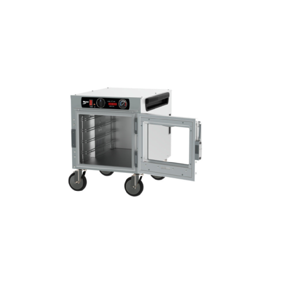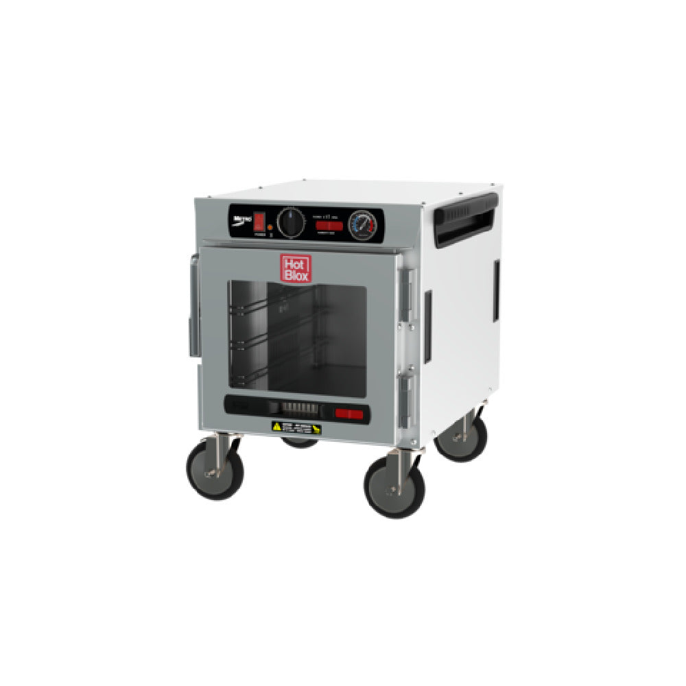 The Metro HBCN4-AC-UC HotBlox™ Insulated Holding Cabinet Narrow (4) Pan Undercounter is a high-performance insulated holding unit designed for diverse culinary environments. This compact cabinet features narrow dimensions to accommodate four pans, making it a space-efficient solution for kitchens with limited room. The undercounter design integrates seamlessly into various kitchen layouts. This cabinet supports both full or half-size steam pans and half-size sheet pans, providing versatile storage options for food service professionals. Equipped with analog controls, it ensures user-friendly operation and precise temperature management. The clear door design facilitates easy monitoring of contents without compromising insulation. Mounted on 5-inch casters, the cabinet ensures mobility, allowing for flexible kitchen arrangements and easy cleaning. Operating at 875 watts with a power requirement of 120/60/1-ph, it comes with a cord featuring a NEMA 5-15P plug for straightforward electrical connectivity. The cabinet is constructed from durable aluminum, enhancing longevity and resistance to kitchen wear. Certified to UL and NSF standards, it upholds rigorous health and safety requirements, and is proudly made in the USA, highlighting its commitment to quality manufacturing. This holding cabinet is an essential asset for food service operations demanding efficient, reliable, and adaptable hot food storage solutions.