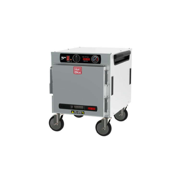The Metro HBCN4-AS-UC HotBlox™ Insulated Holding Cabinet is a versatile and efficient solution designed for the foodservice industry, specifically tailored for kitchens with limited space. This narrow undercounter unit accommodates up to four pans, supporting both full or half-size steam pans and half-size sheet pans, making it suitable for various culinary applications. The cabinet features analog controls, providing users with straightforward temperature management to maintain optimal food quality. Constructed with durable aluminum, the cabinet ensures long-term reliability and easy maintenance. Equipped with a solid door, the unit ensures effective insulation to preserve food temperatures. The cabinet runs on 875 watts power, compatible with a standard 120/60/1-ph electrical setup, and includes a cord with a NEMA 5-15P plug, ensuring ease of installation in most commercial kitchens. Its mobility is enhanced by the inclusion of 5-inch casters, allowing for convenient repositioning as needed. Certified by UL and NSF, this cabinet upholds high safety and sanitation standards, making it a trustworthy addition to any professional kitchen. Proudly made in the USA, the Metro HBCN4-AS-UC offers exceptional functionality and reliability, essential for busy foodservice environments seeking efficient space utilization and consistent food holding performance.