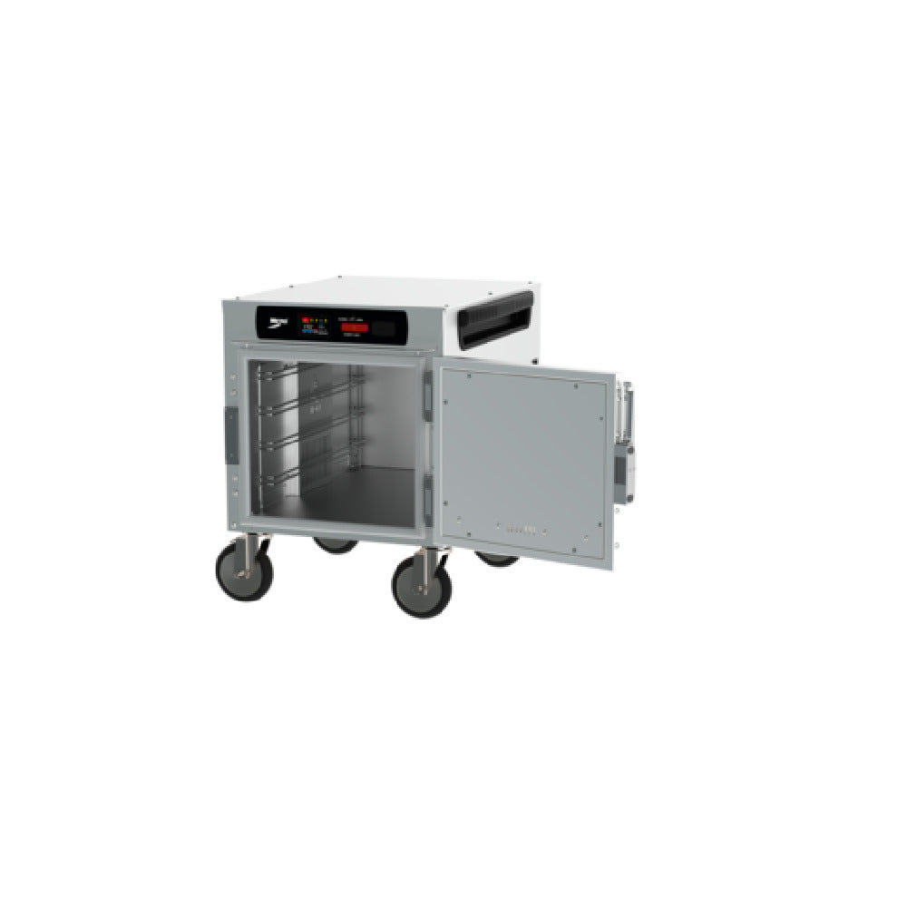 The Metro HBCN4-DS-UC HotBlox™ Insulated Holding Cabinet is a versatile undercounter unit designed for efficient space utilization in commercial kitchens. This narrow cabinet accommodates up to four pans and offers the flexibility to hold full or half-size steam pans or half-size sheet pans, making it suitable for various food service applications. Equipped with a 2.4-inch touchscreen control panel, it allows for precise temperature regulation and easy operation. The cabinet's solid door design ensures secure insulation, while the 5-inch casters provide mobility, facilitating seamless integration into any kitchen layout. With a power output of 875 watts and operating on a 120/60/1-ph electrical supply, it is fitted with a cord and NEMA 5-15P plug for standard compatibility. Constructed from durable aluminum, this holding cabinet is both UL and NSF certified, guaranteeing adherence to safety and quality standards. Proudly made in the USA, the Metro HBCN4-DS-UC combines functionality and reliability, making it an essential asset for any food service establishment aiming to maintain optimal food holding conditions. The cabinet's inclusion of accessories further enhances its practicality, ensuring that it meets the demanding needs of the culinary industry.