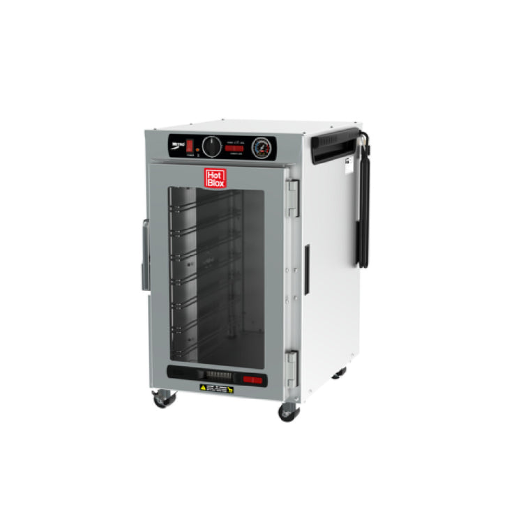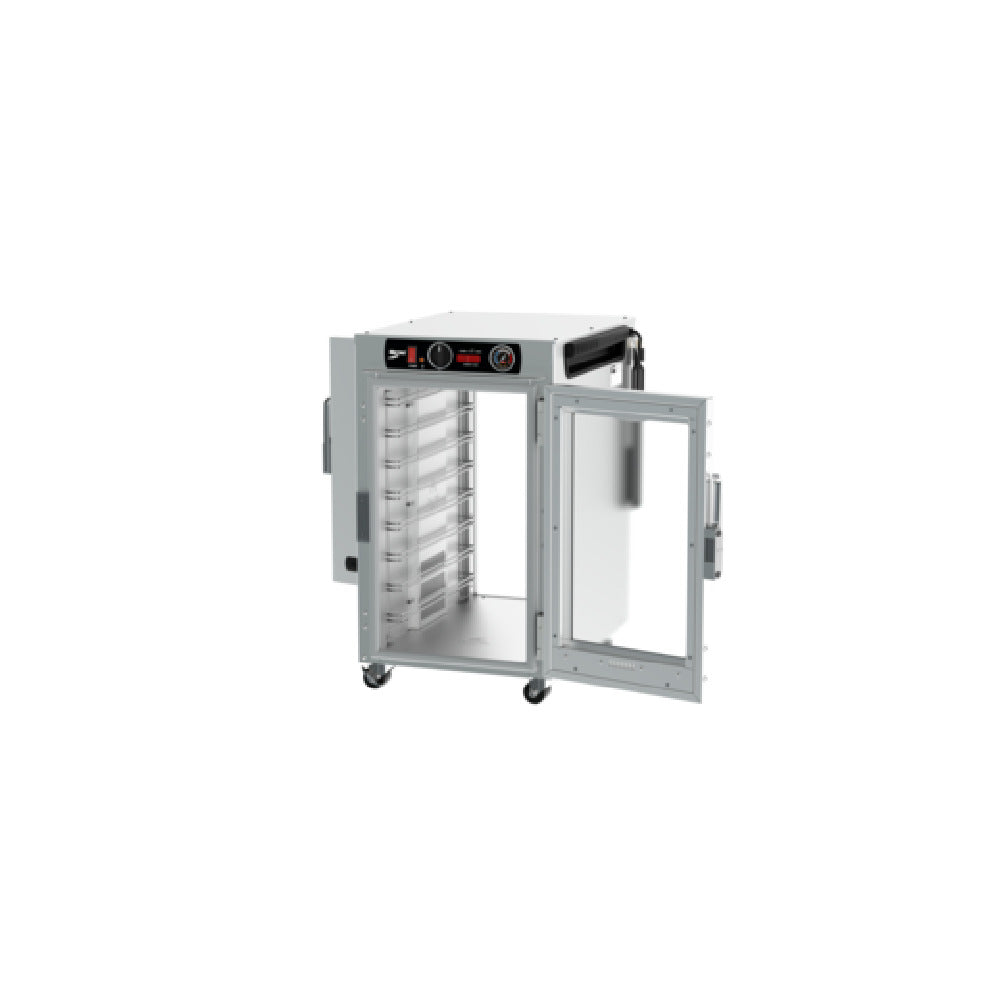 The Metro HBCN8-ACPS-UC HotBlox™ Insulated Holding Cabinet Undercounter Pass-thru is a highly versatile and efficient solution, specifically designed for compact spaces with its narrow profile. This innovative cabinet accommodates up to eight pans and is equipped with an analog controller, ensuring precise temperature management to keep food at optimal serving conditions. The product features a clear front door for easy monitoring of contents and a solid rear door for added insulation, enhancing energy efficiency. Operating at 120v/60/1-ph and consuming 875 watts, it provides reliable performance while being energy-efficient. The inclusion of a cord with a NEMA 5-15P plug ensures compatibility with standard electrical outlets. Recognized for its quality, the cabinet is UL and NSF certified, highlighting its compliance with safety and sanitation standards. Proudly made in the USA, this holding cabinet is ideal for diverse market segments within the food service industry, such as restaurants, catering services, and institutional kitchens, where space-saving solutions and consistent food quality are critical. Its undercounter pass-thru design facilitates easy access and efficient workflow, making it an essential asset in any professional kitchen environment.