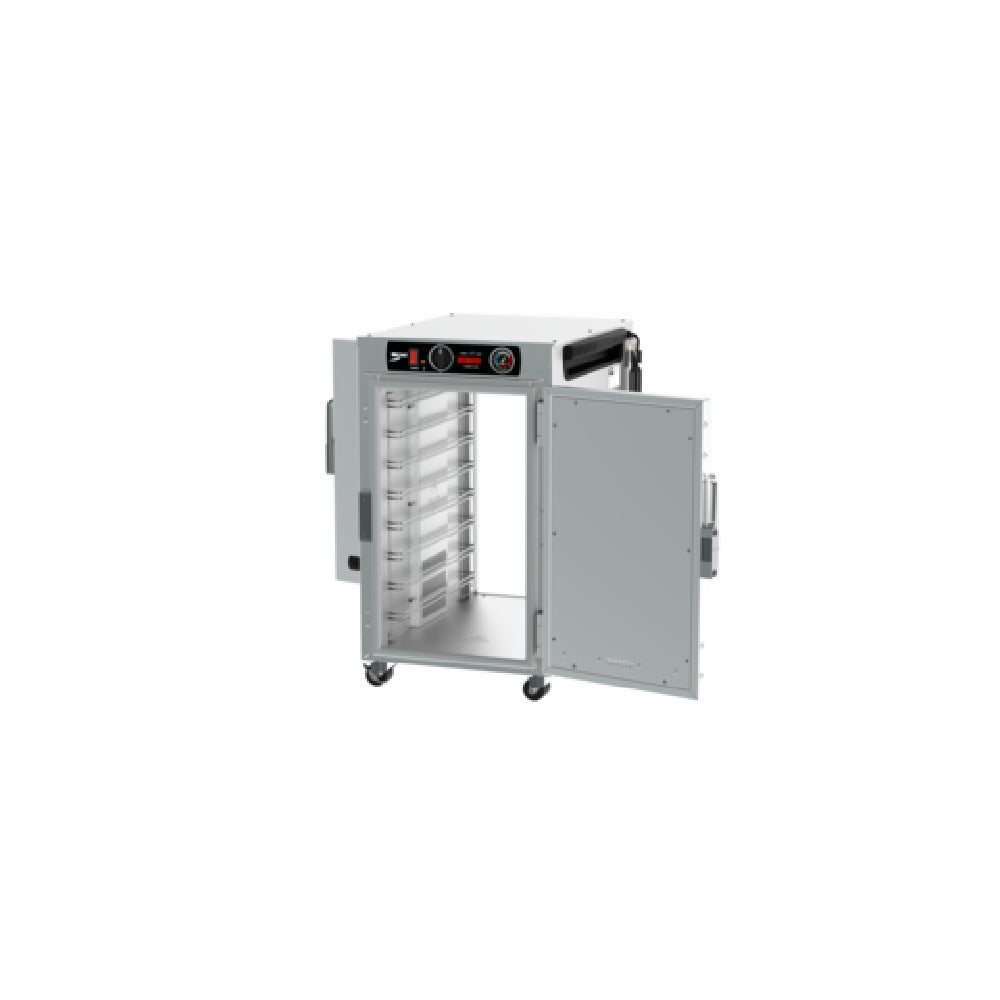 The Metro HBCN8-ASPS-UC HotBlox™ Insulated Holding Cabinet Undercounter Pass-thru is a cutting-edge solution for efficient food storage and temperature management, designed to meet the high demands of the food service industry. This narrow, undercounter unit accommodates eight pans, making it an excellent choice for kitchens with limited space. The pass-thru design enhances workflow efficiency by allowing access from both sides, a feature highly valued in fast-paced environments. Equipped with an analog controller, this cabinet ensures precise temperature control, maintaining optimal holding conditions for various food items. The solid front and rear doors provide robust insulation, effectively preserving the desired temperature. Operating at 120 volts with a power rating of 875 watts, it is designed for energy efficiency while delivering reliable performance. The inclusion of a cord with NEMA 5-15P plug simplifies installation. Certified by UL and NSF, this cabinet meets stringent safety and sanitation standards, reinforcing its quality and dependability. Proudly made in the USA, the Metro HBCN8-ASPS-UC HotBlox™ Insulated Holding Cabinet is a versatile and essential asset for professional kitchens seeking to optimize space and maintain food quality.