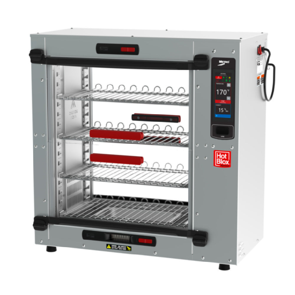 Metro, HBCS8-TP, HotBlox Xpress S8 Quick Access Pass-Thru Holding Cabinet, countertop, insulated, (4) shelves, clear flip doors, Touchscreen controls, LED lighting, accommodates: half size sheet pans, full & fractional steam pans, or packaged food Items, Aluminum construction, 875W, 120v/60/1-ph, cord with NEMA 5-15P, UL, NSF