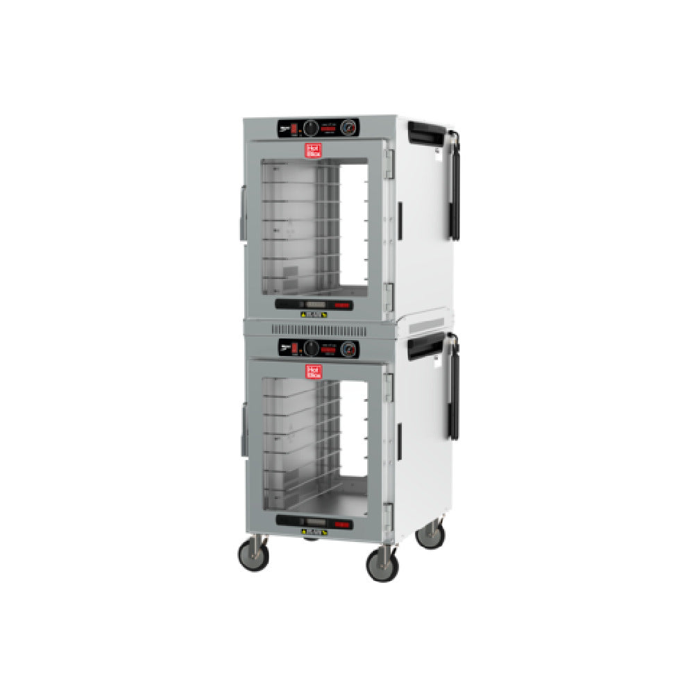 The Metro HBCW16-ACPC-M HotBlox™ Insulated Holding Cabinet is a versatile, mobile, pass-thru unit designed for efficient food storage and temperature management. This wide cabinet accommodates up to 16 pans, making it suitable for various food service operations. Its dual-cavity design allows for simultaneous storage of different items, enhancing operational flexibility. Equipped with an analog controller, the cabinet ensures precise temperature regulation, essential for maintaining food quality. The clear front and rear doors provide easy visibility and access, facilitating efficient workflow in busy kitchens. Powered by two 120v/60/1-ph connections, the cabinet operates at 875 watts, ensuring effective performance. The unit is supplied with a cord featuring a NEMA 5-15P plug for standard compatibility. Certified by UL and NSF, the Metro HBCW16-ACPC-M upholds rigorous safety and sanitation standards, making it a dependable choice in commercial food service environments. Proudly made in the USA, this cabinet exemplifies durability and reliability, catering to the needs of various market segments, from catering businesses to institutional kitchens. Its thoughtful design and construction underscore its commitment to efficiency and quality in food holding solutions.