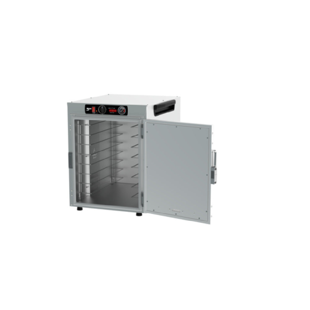The Metro HBCW8-AS-CT HotBlox™ Insulated Holding Cabinet Wide (8) Pan Countertop Stacking is a versatile and efficient solution for maintaining optimal food temperatures in various commercial kitchen environments. This high-performance holding cabinet is designed to accommodate up to eight full or half-size steam and sheet pans, making it an excellent choice for busy restaurants and catering services seeking reliable temperature control. Engineered with a solid door and analog controls, it offers precise temperature management while minimizing energy consumption with its 875-watt power requirement. Crafted from durable aluminum, this unit ensures long-lasting use and resilience in demanding kitchen settings. The HBCW8-AS-CT is equipped with a cord featuring a NEMA 5-15P plug compatible with standard 120/60/1-ph electrical outlets, facilitating easy integration into your existing kitchen layout. As a testament to its high standards, this holding cabinet is UL and NSF certified, ensuring compliance with rigorous safety and sanitation regulations. Made in the USA, the Metro HBCW8-AS-CT HotBlox™ delivers superior performance and reliability, making it a valuable addition to food service operations that require efficient temperature management and space-saving countertop stacking capabilities.