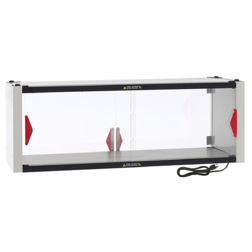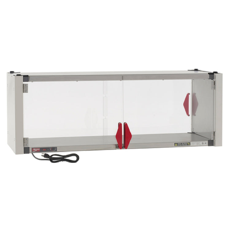 The Metro HS1448-EKIT Super Erecta® Hot Enclosed Heated Shelf Kit is an advanced solution designed to meet the needs of various industry segments, particularly those requiring temperature-controlled storage. This kit features a 48"W x 14"D heated shelf with an adjustable thermostat capable of reaching a maximum temperature of 200°F, ensuring optimal warmth for stored items. The enclosed design includes powder-coated side panels and clear polycarbonate sliding front doors, along with clear hinged rear doors, providing excellent visibility and accessibility while maintaining heat retention. Complementing the heated shelf is a non-heated, stainless steel top shelf, offering additional storage flexibility. The kit is constructed with four split sleeves for easy assembly and stability. Operating on 120v/60/1-ph, this shelf kit draws 400 watts and 3.4 amps, and it is equipped with a cord and NEMA 5-15P plug for simple installation. Certified by NSF and cULus, this product meets high standards of safety and quality. Proudly made in the USA, the Metro HS1448-EKIT is perfect for commercial kitchens, catering businesses, and food service operations that demand reliable, efficient, and versatile heated storage solutions.