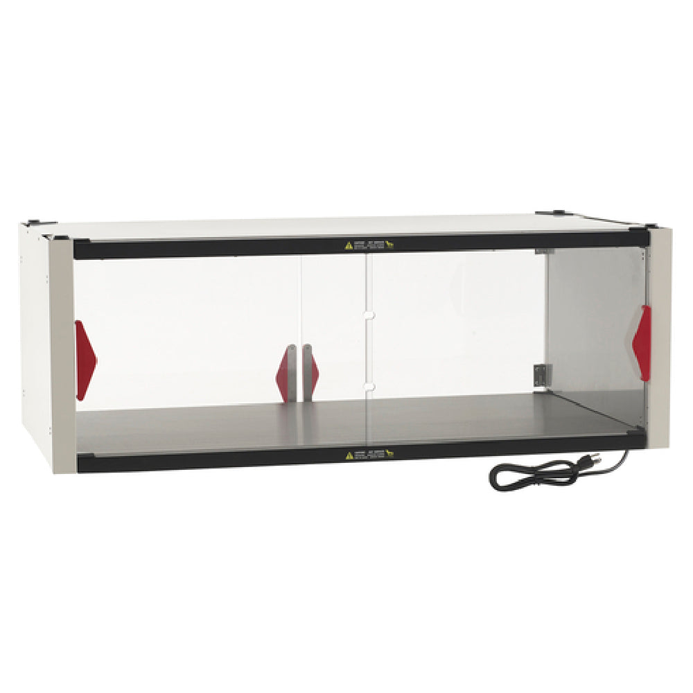 - 48"W x 24"D heated shelf with durable powdercoated side panels