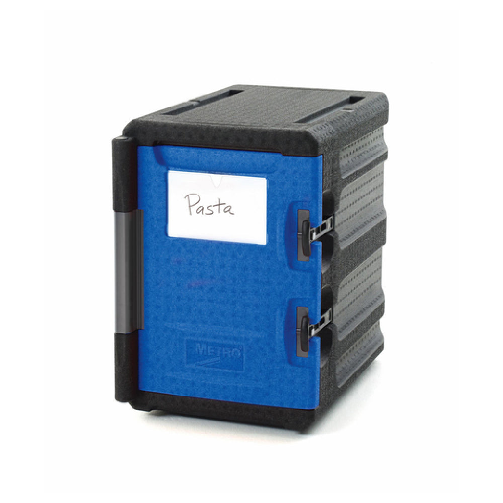 The Metro ML400-BU Mightylite™ Pan Carrier is a front-load, insulated unit specifically engineered for efficient food transportation across diverse culinary environments. With a substantial capacity to accommodate six pans, it supports full, 1/2, and 1/3 sized pans with depths ranging from 2-1/2" to 8". The design integrates eight sturdy handles, ensuring ease of handling and maneuverability. This pan carrier's stackable feature allows for optimal space utilization, while an elastomer travel latch secures the contents during transit. A built-in door seal enhances thermal retention, providing reliable insulation to maintain food temperature. Additionally, it includes a label holder for organized content identification and a bonus wire caddy for enhanced functionality. Constructed from ultra-lightweight, yet durable expanded polypropylene, the unit achieves a balance between strength and ease of transport. Its black and blue color scheme adds a modern aesthetic touch, and it is NSF certified, affirming its compliance with industry standards. The Metro ML400-BU Mightylite™ Pan Carrier is an invaluable asset for catering services, professional kitchens, and food delivery enterprises, offering practicality and durability tailored to meet the dynamic demands of the food service industry.