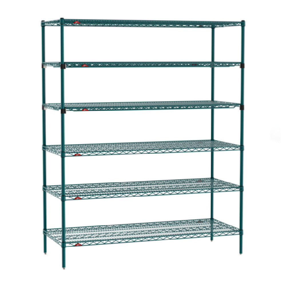The Metro SEZ-246074K3-S-42 Super Erecta® Starter Shelving Unit is a versatile storage solution measuring 60"W x 24"D x 74"H. This unit features six tiers, including four Super Erecta wire shelves and two EZ-ADD shelves, providing ample space for various storage needs. It comes with four posts, ensuring stability and durability for diverse applications. The shelving unit is coated with Metroseal Green, a corrosion-resistant epoxy finish, which includes Microban antimicrobial product protection, enhancing hygiene and longevity. The unit is designed as a knock-down (KD) system, allowing for easy assembly and customization according to specific requirements. Certified by NSF, this shelving unit meets high public health and safety standards, making it ideal for use in commercial kitchens, healthcare facilities, and industrial environments. The unique combination of corrosion resistance and antimicrobial protection makes it particularly beneficial in settings where cleanliness and durability are paramount. The Metro SEZ-246074K3-S-42 Super Erecta® Starter Shelving Unit is engineered to provide reliable storage with a focus on flexibility and efficiency, addressing the needs of different segment markets within industries that demand robust and hygienic storage solutions.
