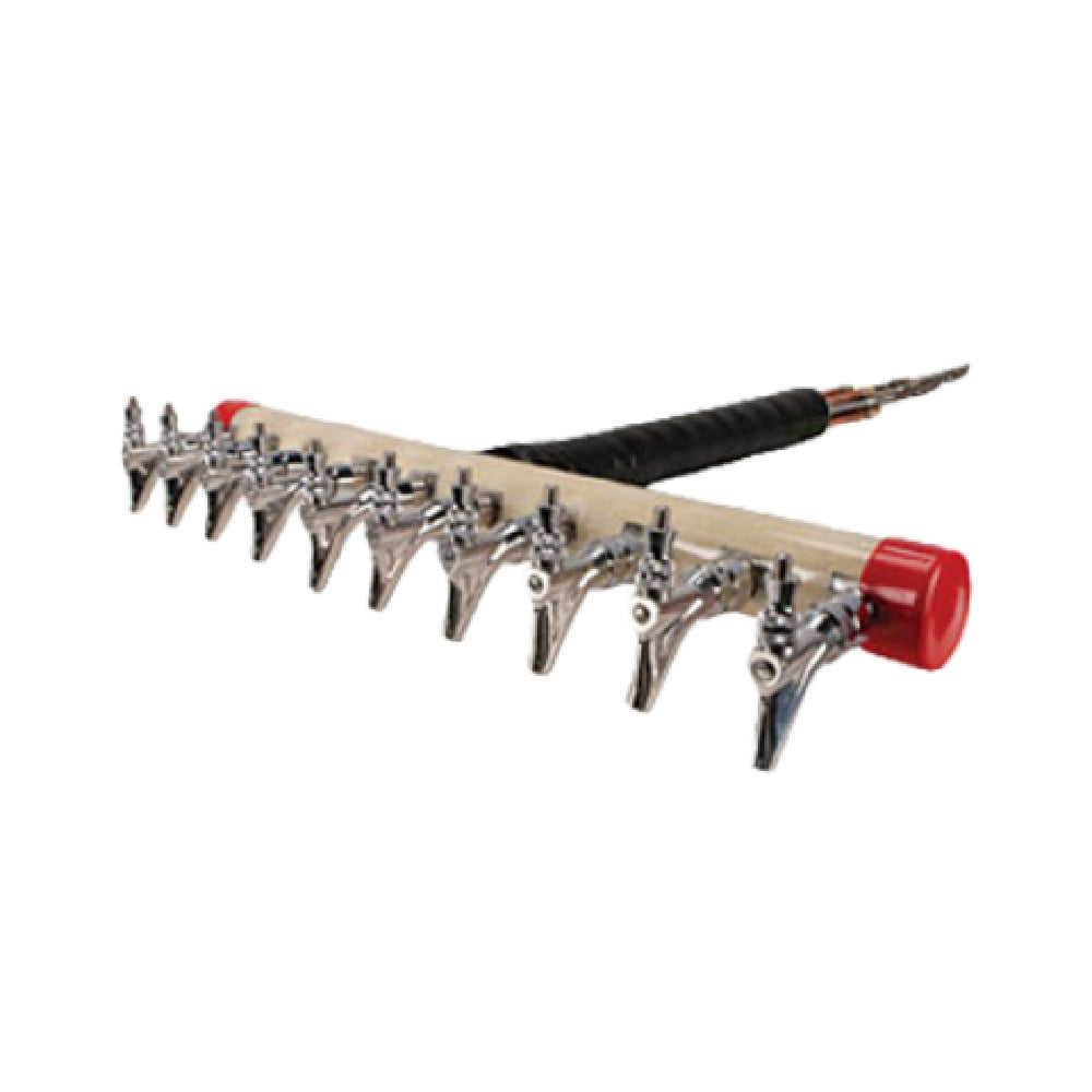 The Micro Matic 1736-S Kool-Rite™ Insert Module Short Shanks 30"W is a specialized dispensing solution tailored for efficiency and durability in commercial settings. This module features ten 304 stainless steel faucets, ensuring a high level of corrosion resistance and longevity. Each faucet is connected via 1-5/8" leak-proof stainless steel shanks, designed for minimal maintenance and reliable performance. The shanks are precisely positioned with a 3" on-center (OC) configuration, optimizing space and functionality within the unit. The module integrates stainless steel product lines alongside copper coolant lines, indicative of a robust design focused on maintaining product integrity and consistent temperature control. This system includes a cooling block, enhancing its ability to manage thermal conditions effectively. Certified by NSF, this insert module meets stringent public health and safety standards, making it a trusted choice for various industry segments. With its 30"W configuration, the Kool-Rite™ Insert Module is suitable for environments requiring compact and efficient dispensing solutions, particularly in settings where precise temperature management and high hygiene standards are paramount. This product embodies a harmonious blend of advanced engineering and practical design, making it a valuable asset in any professional beverage dispensing operation.